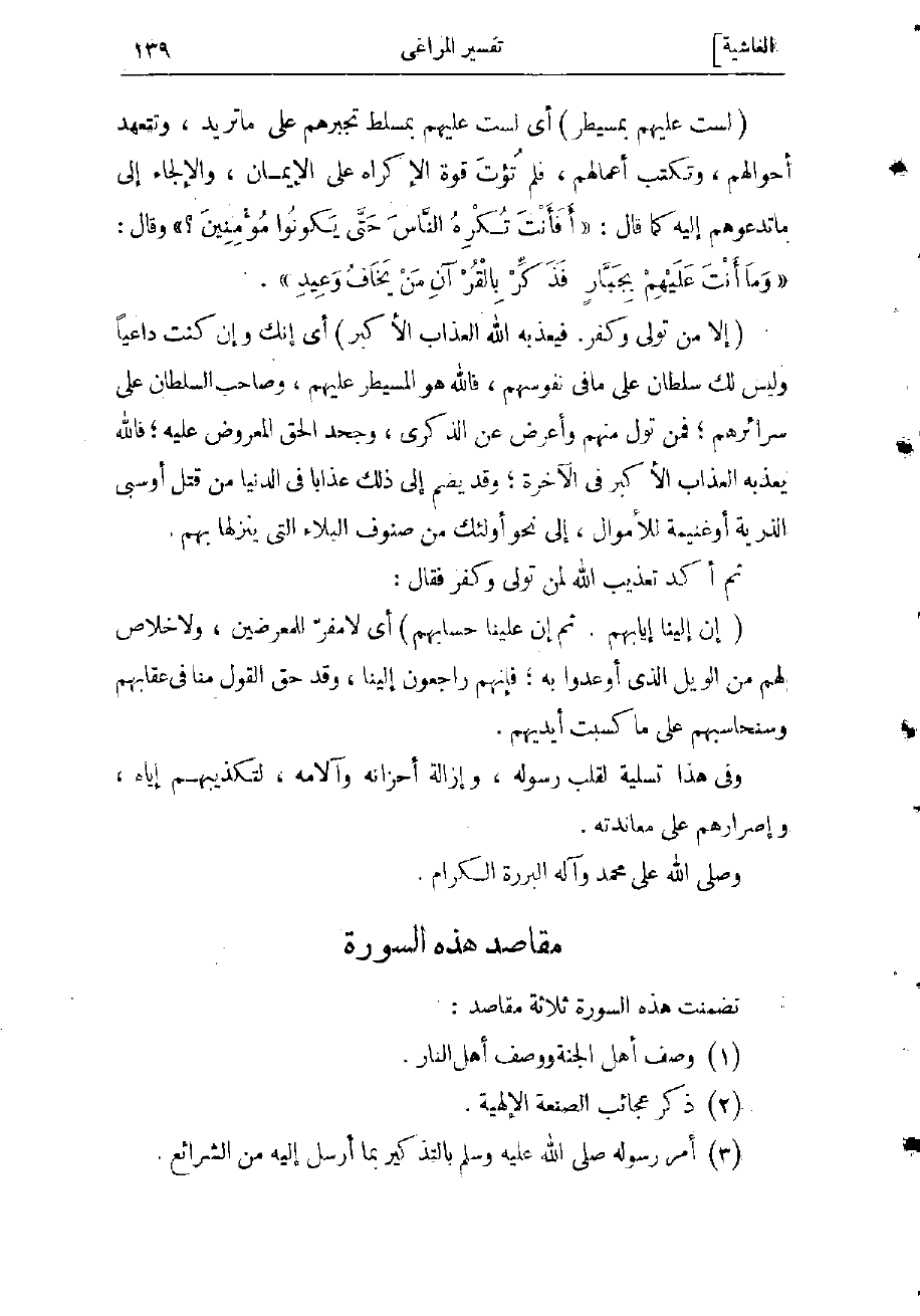 (لَسْتَ عَلَيْهِمْ بِمُصَيْطِرٍ) أي لست عليهم بمسلط تجبرهم على ما تريد، وتتعهد أحوالهم، وتكتب أعمالهم، فلم نؤت قوة الإكراه على الإيمان، والإلجاء إلى ما تدعوهم إليه كما قال: «أَفَأَنْتَ تُكْرِهُ النَّاسَ حَتَّى يَكُونُوا مُؤْمِنِينَ؟» وقال: