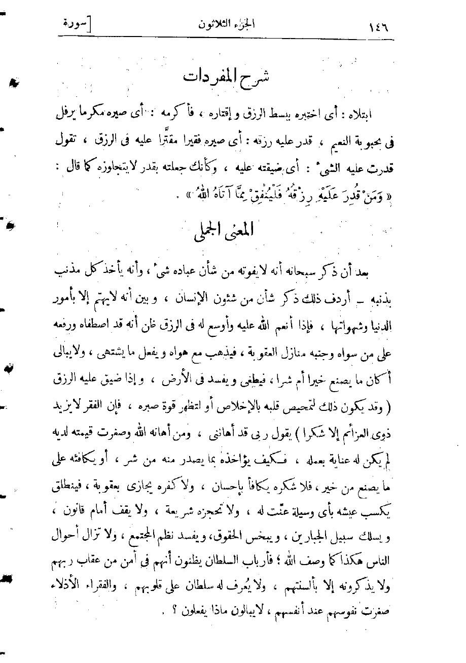 ابتلاه: أي اختبره ببسط الرزق وإقتاره، فأكرمه: أي صيره مكرما يرفل فى بحبوحة النعيم، قدر عليه رزقه: أي صيره فقيرا مقترا عليه فى الرزق، تقول قدرت عليه الشيء: أي ضيقته عليه، وكأنك جعلته بقدر لا يتجاوزه كما قال: «وَمَنْ قُدِرَ عَلَيْهِ رِزْقُهُ فَلْيُنْفِقْ مِمَّا آتاهُ اللَّهُ» .