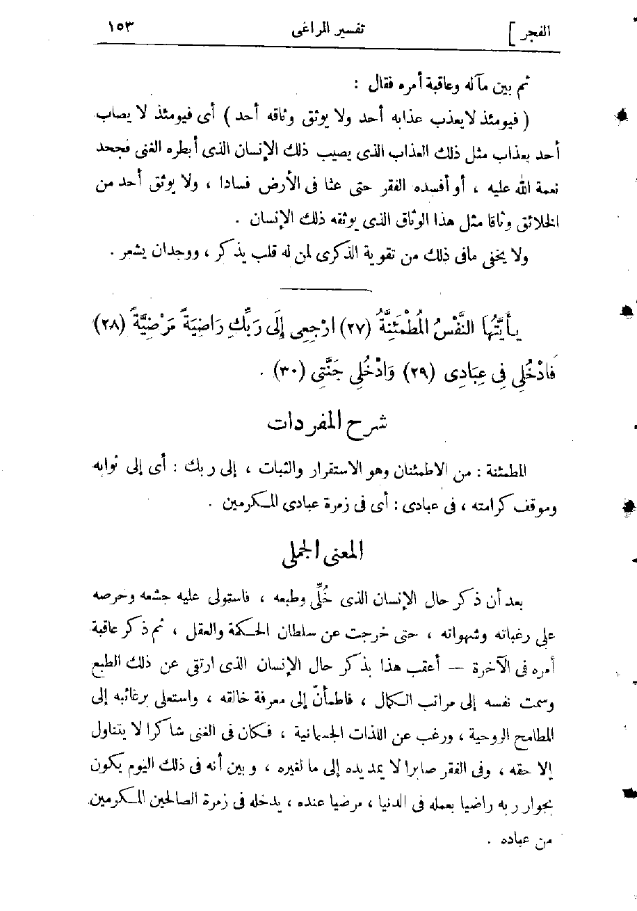 بعد أن ذكر حال الإنسان الذي خلّى وطبعه، فاستولى عليه جشعه وحرصه على رغباته وشهواته، حتى خرجت عن سلطان الحكمة والعقل، ثم ذكر عاقبة أمره فى الآخرة- أعقب هذا بذكر حال الإنسان الذي ارتقى عن ذلك الطبع وسمت نفسه إلى مراتب الكمال، فاطمأن إلى معرفة خالقه، واستعلى برغائبه إلى المطامع الروحية، ورغب عن اللذات الجسمانية، فكان فى الغنى شاكرا لا يتناول إلا حقه، وفى الفقر صابرا لا يمد يده إلى ما لغيره، وبين أنه فى ذلك اليوم يكون بجوار ربه راضيا بعمله فى الدنيا، مرضيا عنده، يدخله فى زمرة الصالحين المكرمين من عباده.