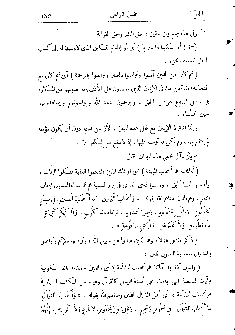 (ثُمَّ كانَ مِنَ الَّذِينَ آمَنُوا وَتَواصَوْا بِالصَّبْرِ وَتَواصَوْا بِالْمَرْحَمَةِ) أي ثم كان مع اقتحامه العقبة من صادق الإيمان الذين يصبرون على الأذى وما يصيبهم من المكاره فى سبيل الدفاع عن الحق، ويرحمون عباد الله ويواسونهم ويساعدونهم حين البأساء.