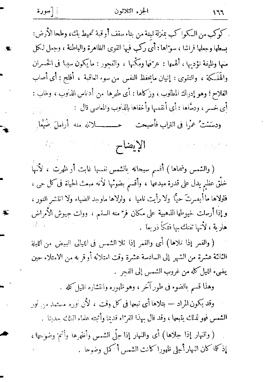 (وَالشَّمْسِ وَضُحاها) أقسم سبحانه بالشمس نفسها غابت أو ظهرت، لأنها خلق عظيم على قدرة مبدعها، وأقسم بضوئها لأنه مبعث الحياة فى كل حى، فلولاها ما أبصرت حيّا ولا رأيت ناميا، ولولاها ما وجد الضياء ولا انتشر النور، وإذا أرسلت خيوطها الذهبية على مكان فرّ منه السقم، وولت جيوش الأمراض هاربة، لأنها تفتك بها فتكا ذريعا.