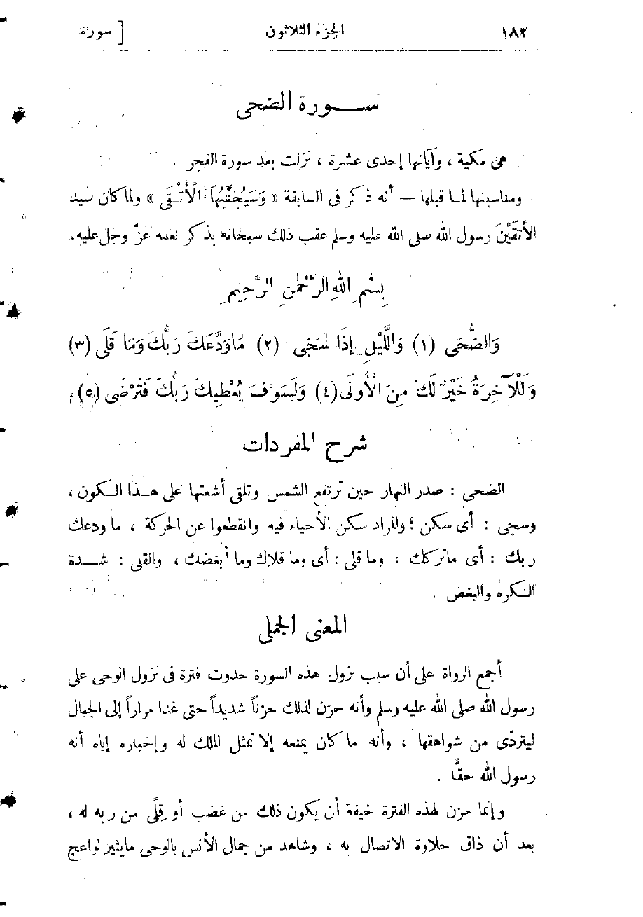 الضحى: صدر النهار حين ترتفع الشمس وتلقى أشعتها على هذا الكون، وسجى: أي سكن والمراد سكن الأحياء فيه وانقطعوا عن الحركة، ما ودعك ربك: أي ما تركك، وما قلى: أي وما قلاك وما أبغضك، والقلى: شدة الكره والبغض.