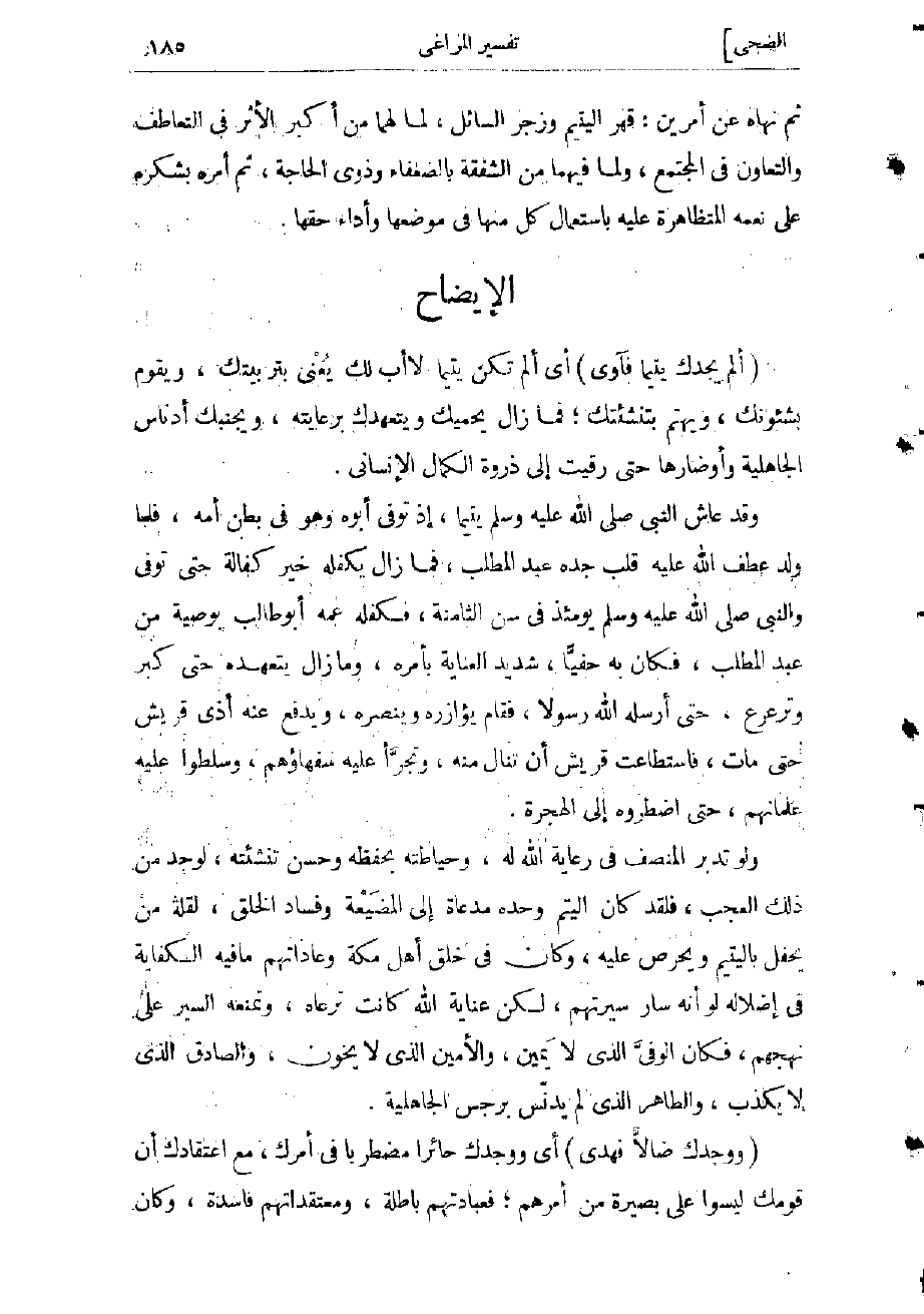 (أَلَمْ يَجِدْكَ يَتِيماً فَآوى) أي ألم تكن يتيما لا أب لك يعنى بتربيتك، ويقوم بشئونك، ويهتم بتنشئتك فما زال يحميك ويتعهدك برعايته، ويجنبك أدناس الجاهلية وأوضارها حتى رقيت إلى ذروة الكمال الإنسانى.