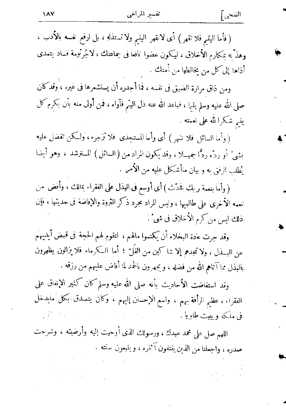 (وَأَمَّا بِنِعْمَةِ رَبِّكَ فَحَدِّثْ) أي أوسع فى البذل على الفقراء بمالك، وأفض من نعمه الأخرى على طالبيها، وليس المراد مجرد ذكر الثروة والإفاضة فى حديثها، فإن ذلك ليس من كرم الأخلاق فى شىء.