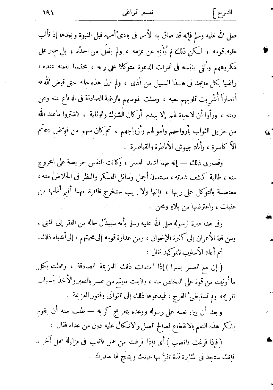 وقصارى ذلك- إنه مهما اشتد العسر، وكانت النفس حريصة على الخروج منه، طالبة كشف شدته، مستعملة أجمل وسائل الفكر والنظر فى الخلاص منه، معتصمة بالتوكل على ربها، فإنها ولا ريب ستخرج ظافرة مهما أقيم أمامها من عقبات واعترضها من بلايا ومحن وفى هذا عبرة لرسوله صلى الله عليه وسلم بأنه سيبدّل حاله من الفقر إلى الغنى، ومن قلة الأعوان إلى كثرة الإخوان، ومن عداوة قومه إلى محبتهم إلى أشباه ذلك.