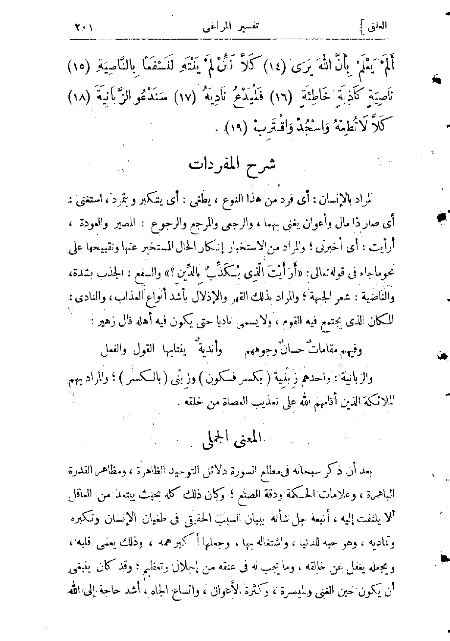 أي صار ذا مال وأعوان يغنى بهما، والرجعى والمرجع والرجوع: المصير والعودة، أرأيت: أي أخبرنى والمراد من الاستخبار إنكار الحال المستخبر عنها وتقبيحها على نحو ما جاء فى قوله تعالى: «أَرَأَيْتَ الَّذِي يُكَذِّبُ بِالدِّينِ؟» والسفع: الجذب بشدة والناصية: شعر الجبهة والمراد بذلك القهر والإذلال بأشد أنواع العذاب، والنادي: