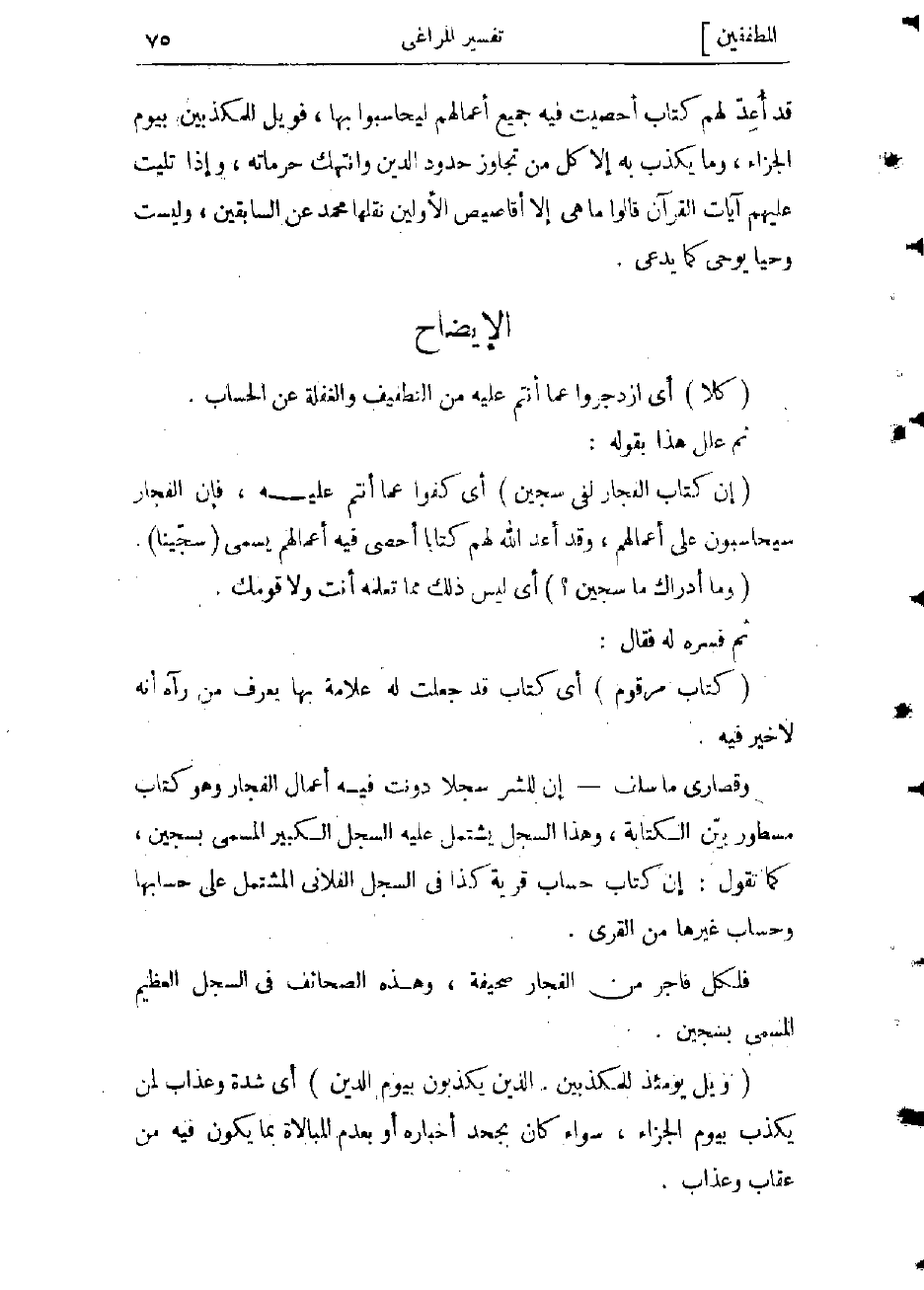 إن كتاب حساب قرية كذا فى السجل الفلاني المشتمل على حسابها وحساب غيرها من القرى فلكل فاجر من الفجار صحيفة. وهذه الصحائف فى السجل العظيم، المسمى بسجين.