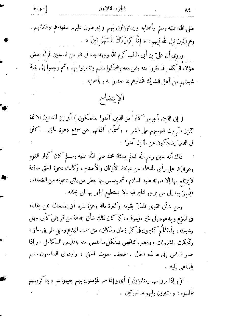 وروى أن علىّ بن أبى طالب كرم الله وجهه جاء فى نفر من المسلمين فرآه بعض هؤلاء الكفار فسخروا منه وممن معه وضحكوا منهم وتغامزوا بهم، ثم رجعوا إلى بقية شيعتهم من أهل الشرك فحدثوهم بما صنعوا به وبأصحابه.
