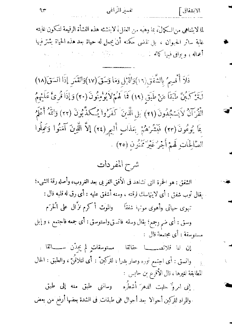 الشفق: هو الحمرة التي تشاهد فى الأفق الغربي بعد الغروب، وأصله رقة الشيء، يقال ثوب شفق: أي لا يتماسك لرقته، ومنه أشفق عليه: أي رق له قلبه قال: