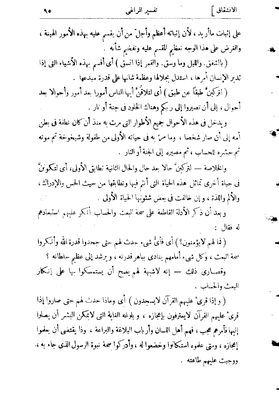 (بِالشَّفَقِ. وَاللَّيْلِ وَما وَسَقَ. وَالْقَمَرِ إِذَا اتَّسَقَ) أي أقسم بهذه الأشياء التي إذا تدبر الإنسان أمرها، استدل بجلالها وعظمة شأنها على قدرة مبدعها.