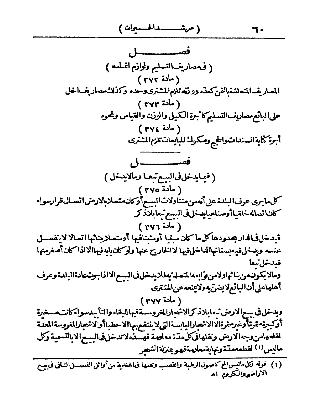 كل ما جرى عرف البلدة على أنه من متنازلات المبيع أو كان متصلاً بالأرض اتصال قرار سواء كان اتصاله خلقياً أو صناعياً يدخل في البيع تبعاً بلا ذكر.