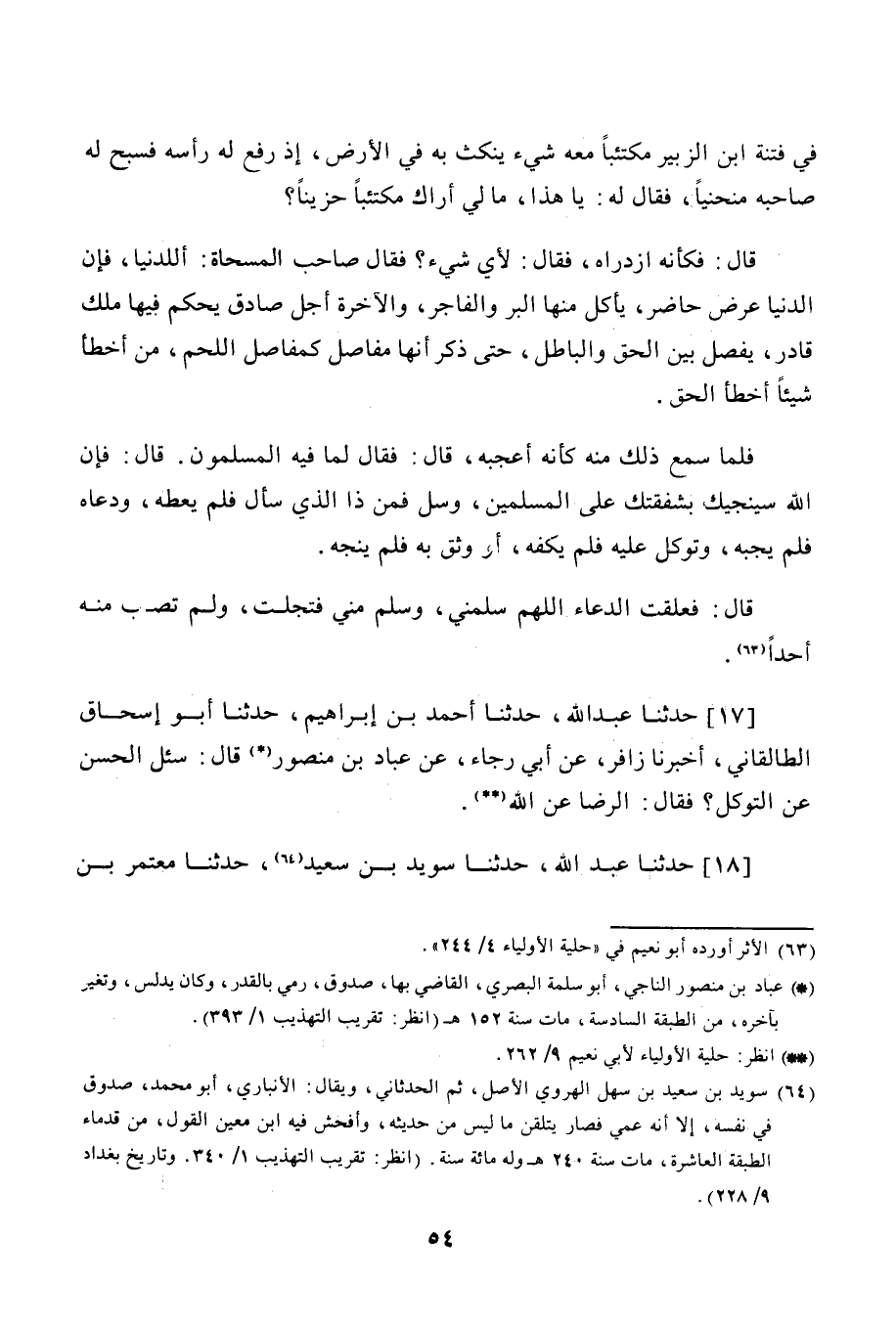 17 - حَدَّثَنَا عَبْدُ اللَّهِ، نا أَحْمَدُ بْنُ إِبْرَاهِيمَ، نا أَبُو إِسْحَاقَ الطَّلَقَانِيُّ، أنا زَافِرٌ، عَنْ أَبِي رَجَاءٍ، عَنْ عَبَّادِ بْنِ مَنْصُورٍ، قَالَ: سُئِلَ الْحَسَنُ عَنِ التَّوَكُّلِ، فَقَالَ: «§الرِّضَا عَنِ اللَّهِ»