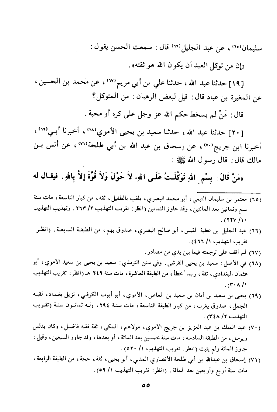 20 - حَدَّثَنَا عَبْدُ اللَّهِ، نا سَعِيدُ بْنُ يَحْيَى الْقُرَشِيُّ، أنا أَبِي، أنا ابْنُ جُرَيْجٍ، عَنْ إِسْحَاقَ بْنِ عَبْدِ اللَّهِ بْنِ أَبِي طَلْحَةَ، عَنْ أَنَسِ بْنِ مَالِكٍ، قَالَ: قَالَ رَسُولُ اللَّهِ صَلَّى اللهُ عَلَيْهِ وَسَلَّمَ: " مَنْ قَالَ: §بِاسْمِ اللَّهِ، تَوَكَّلْتُ عَلَى اللَّهِ، لَا حَوْلَ وَلَا قُوَّةَ إِلَّا بِاللَّهِ، فَيُقَالُ لَهُ -[56]- حِينَئِذٍ: كُفِيتَ، وَوُقِيتَ، وَتَنَحَّى لَهُ الشَّيْطَانُ "