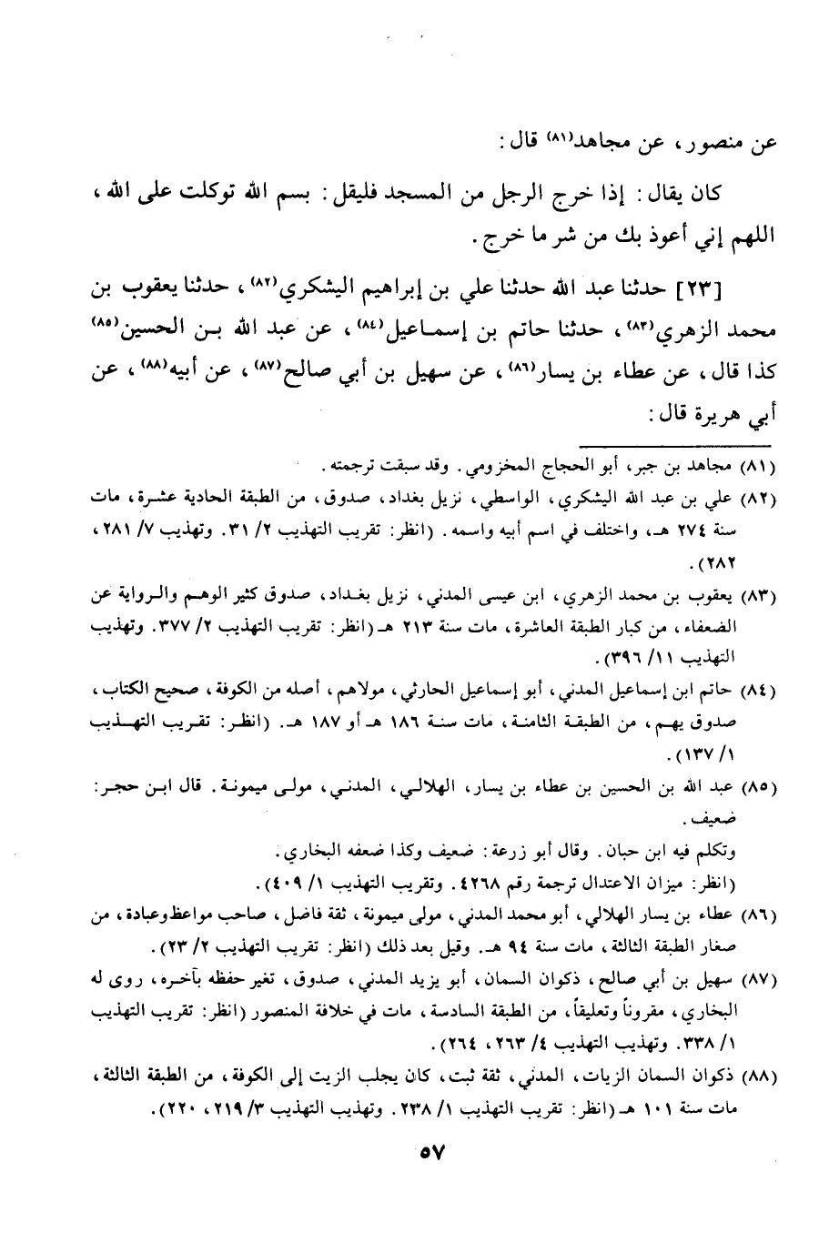 23 - حَدَّثَنَا عَبْدُ اللَّهِ، نا عَلِيُّ بْنُ إِبْرَاهِيمَ الْيَشْكُرِيُّ، نا يَعْقُوبُ بْنُ مُحَمَّدٍ الزُّهْرِيُّ، نا حَاتِمُ بْنُ إِسْمَاعِيلَ، عَنْ عَبْدِ اللَّهِ بْنِ حُسَيْنِ بْنِ عَطَاءِ بْنِ يَسَارٍ، عَنْ سُهَيْلِ بْنِ أَبِي صَالِحٍ، عَنْ أَبِيهِ، عَنْ أَبِي هُرَيْرَةَ، قَالَ: -[58]- كَانَ رَسُولُ اللَّهِ صَلَّى اللهُ عَلَيْهِ وَسَلَّمَ إِذَا خَرَجَ مِنْ بَيْتِهِ قَالَ: «§بِاسْمِ اللَّهِ، وَلَا قُوَّةَ إِلَّا بِاللَّهِ، التُّكْلَانُ عَلَى اللَّهِ»