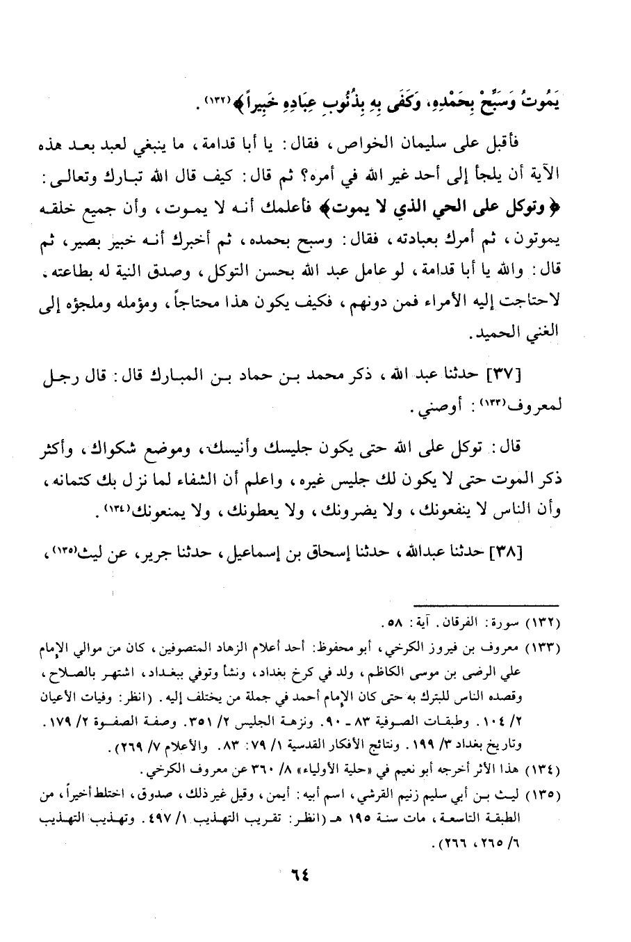 37 - حَدَّثَنَا عَبْدُ اللَّهِ، حَدَّثَنِي مُحَمَّدُ بْنُ حَمَّادِ بْنِ الْمُبَارَكِ، قَالَ: قَالَ رَجُلٌ لِمَعْرُوفٍ: أَوْصِنِي. قَالَ: «§تَوَكَّلْ عَلَى اللَّهِ حَتَّى يَكُونَ جَلِيسَكَ وَأَنِيسَكَ، وَمَوْضِعَ شَكْوَاكَ، وَأَكْثِرْ ذِكْرَ الْمَوْتِ حَتَّى لَا يَكُونَ لَكَ جَلِيسٌ غَيْرُهُ، وَاعْلَمْ أَنَّ الشِّفَاءَ لِمَا نَزَلَ بِكَ كِتْمَانُهُ، وَأَنَّ النَّاسَ لَا يَنْفَعُونَكَ وَلَا يَضُرُّونَكَ، وَلَا يُعْطُونَكَ وَلَا يَمْنَعُونَكَ»