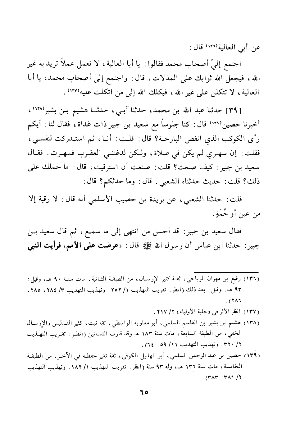 39 - حَدَّثَنَا عَبْدُ اللَّهِ، نا أَبِي، نا هُشَيْمُ بْنُ بَشِيرٍ، أنا حُصَيْنٌ، قَالَ: كُنَّا جُلُوسًا مَعَ سَعِيدِ بْنِ جُبَيْرٍ ذَاتَ غَدَاةٍ، فَقَالَ لَنَا: أَيُّكُمْ رَأَى الْكَوْكَبَ الَّذِي انْقَضَّ الْبَارِحَةَ؟ قَالَ: قُلْتُ: أَنَا. ثُمَّ اسْتَدْرَكْتُ نَفْسِي، فَقُلْتُ: إِنَّ سَهَرِي لَمْ يَكُنْ فِي صَلَاةٍ، وَلَكِنْ لَدَغَتْنِي الْعَقْرَبُ؛ فَسَهِرْتُ. فَقَالَ سَعِيدُ بْنُ جُبَيْرٍ: كَيْفَ صَنَعْتَ؟ قُلْتُ: صَنَعْتُ أَنِ اسْتَرْقَيْتُ. قَالَ: مَا حَمَلَكَ عَلَى ذَلِكَ؟ قُلْتُ: حَدِيثٌ حَدَّثَنَاهُ الشَّعْبِيُّ. قَالَ: وَمَا حَدَّثَكُمْ؟ قَالَ: قُلْتُ: حَدَّثَنَا الشَّعْبِيُّ، عَنْ بُرَيْدَةَ بْنِ حُصَيْبٍ الْأَسْلَمِيِّ أَنَّهُ قَالَ: «§لَا رُقْيَةَ إِلَّا مِنْ عَيْنٍ أَوْ حُمَةٍ» فَقَالَ سَعِيدُ بْنُ جُبَيْرٍ: «قَدْ أَحْسَنَ مَنِ انْتَهَى إِلَى مَا سَمِعَ»