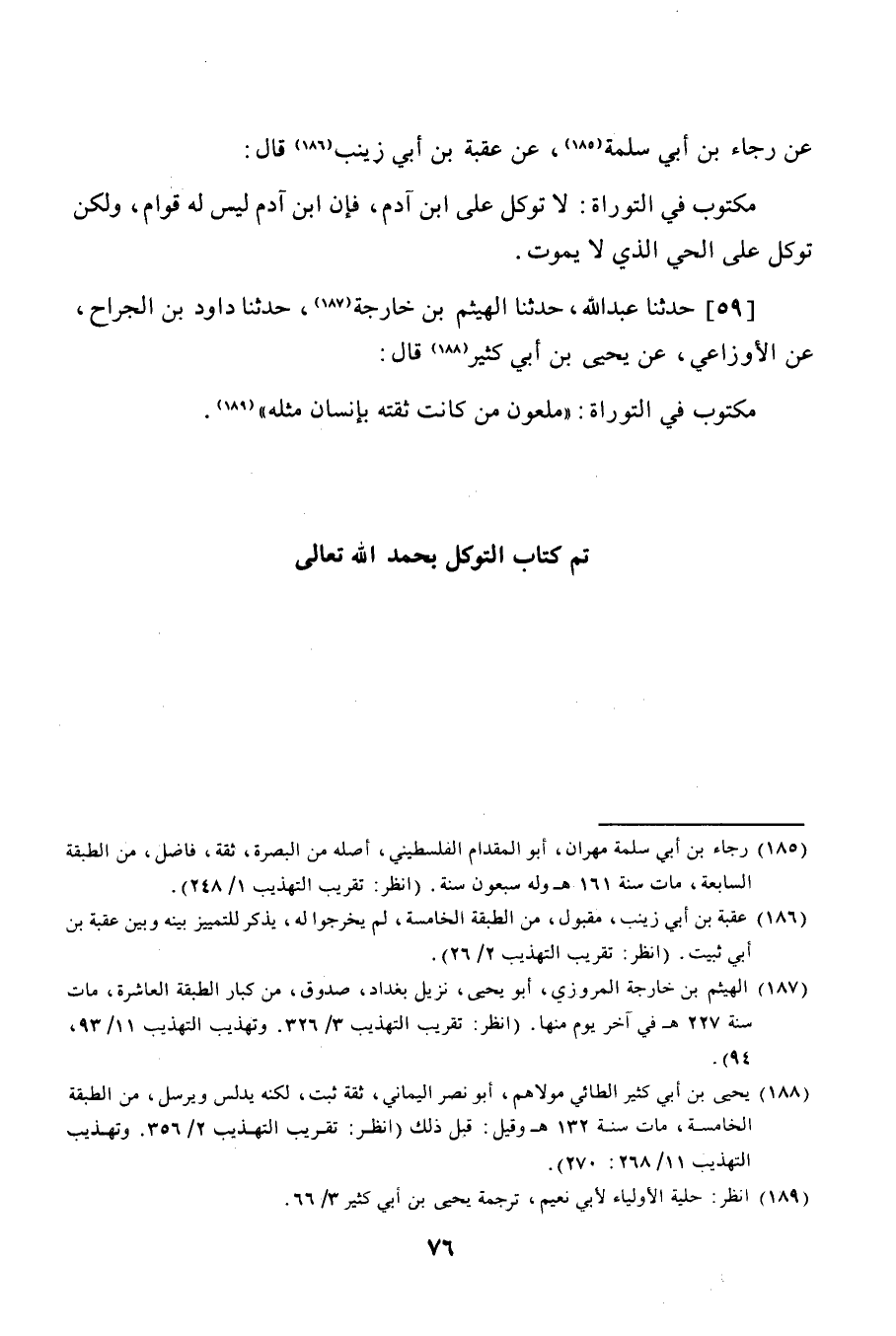 59 - حَدَّثَنَا عَبْدُ اللَّهِ، نا الْهَيْثَمُ بْنُ خَارِجَةَ، نا رَوَّادُ بْنُ الْجَرَّاحِ، عَنِ الْأَوْزَاعِيِّ، عَنْ يَحْيَى بْنِ أَبِي كَثِيرٍ، قَالَ: مَكْتُوبٌ فِي التَّوْرَاةِ: «§مَلْعُونٌ مَنْ كَانَ ثِقَتُهُ بِإِنْسَانٍ مِثْلِهِ»