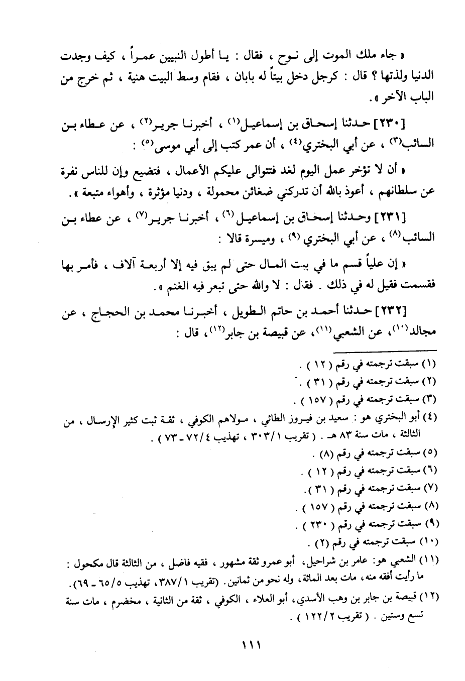 230 - حدثنا إسحاق بن إسماعيل، أخبرنا جرير، عن عطاء بن السائب، عن أبي البختري: أن عمر كتب إلى أبي موسى: