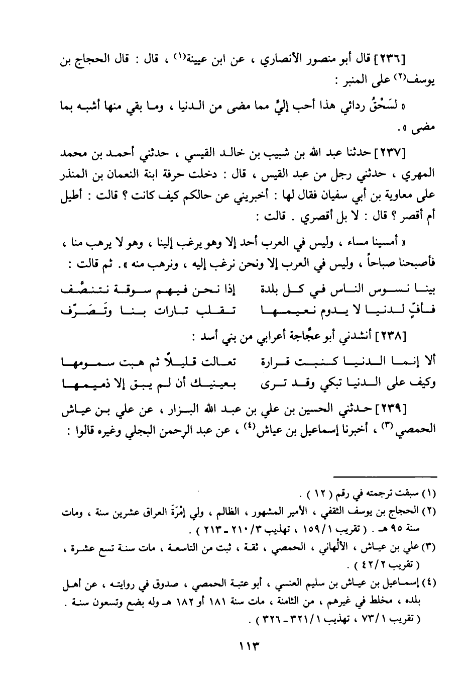 239 - حدثني الحسين بن علي بن عبد الله البزار، عن علي بن عياش الحمصي، أخبرنا إسماعيل بن عياش، عن عبد الرحمن البجلي وغيره قالوا: -[114]- قدم على معاوية رجل من نجران يقولون: كان له يوم قدم عليه مائة سنة، فسأله عن الدنيا فقال: سنوات بلاء، وسنوات رخاء، يوم ويوم، وليلة وليلة، يولد مولود، ويهلك هالك، فلولا المولود باد الخلق، ولولا الهالك ضاقت الدنيا بمن فيها.