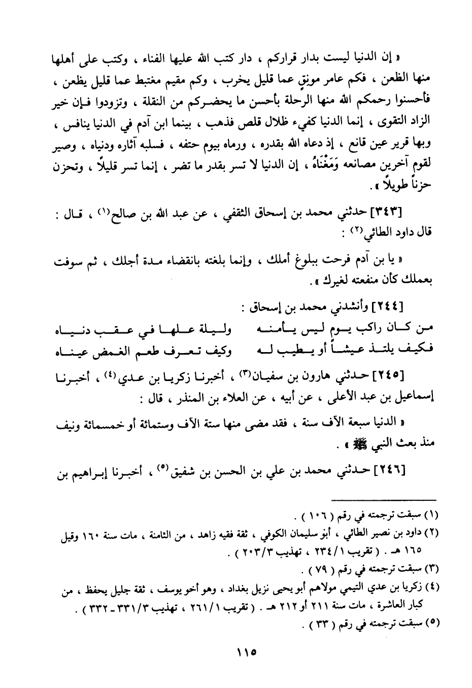 246 - حدثني محمد بن علي بن الحسن بن شفيق، أخبرنا إبراهيم بن -[116]- الأشعث، عن فضيل بن عياض، قال: بلغني أن رجلاً من العباد قال: الدنيا سبعة آلاف سنة، لأعبدن فيها لعلي أن أنجو من يوم كان مقداره ألف سنة ولعله لم يعش بعد مقالته هذه يوماً واحداً فأعطاه الله على نيته.
