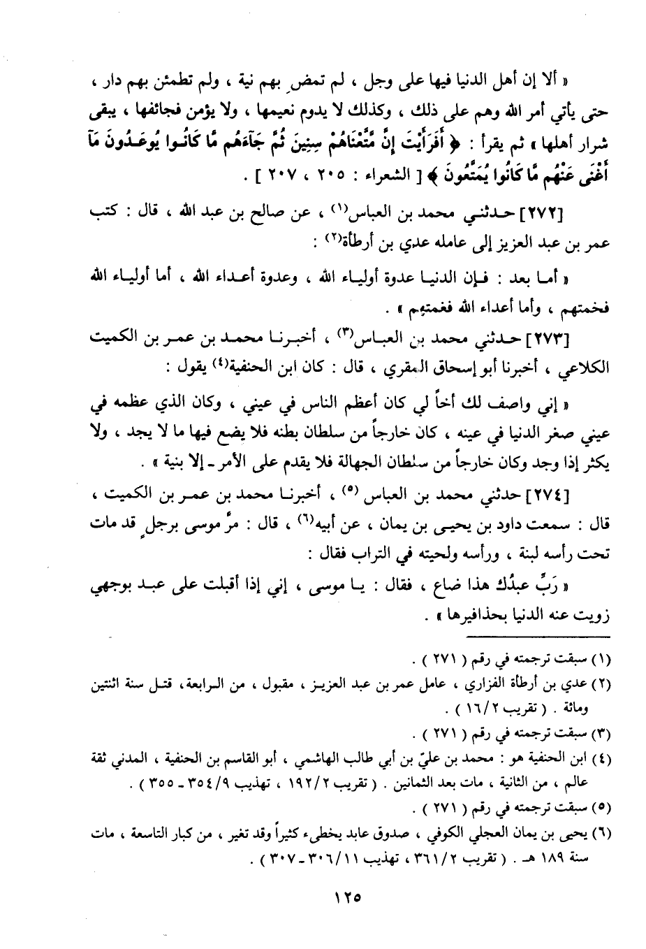 272 - حدثني محمد بن العباس، عن صالح بن عبد الله، قال: كتب عمر بن عبد العزيز إلى عامله عدي بن أرطأة: