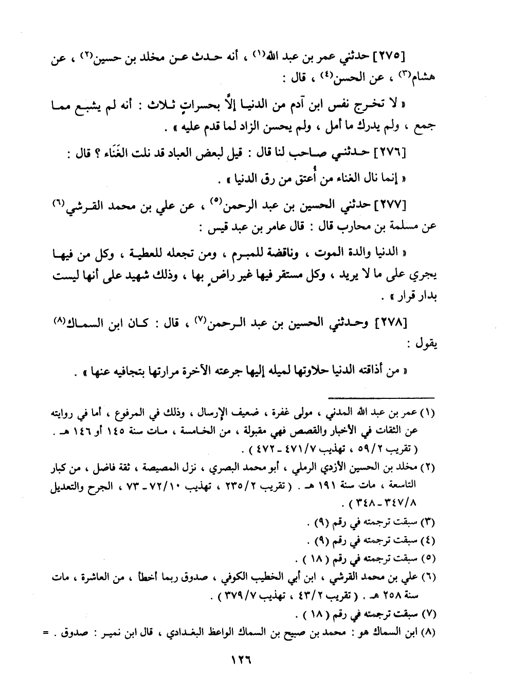 275 - حدثني عمر بن عبد الله، أنه حدث عن مخلد بن حسين، عن هشام، عن الحسن، قال: لا تخرج نفس ابن آدم من الدنيا إلا بحسرات ثلاث: أنه لم يشبع مما جمع، ولم يدرك ما أمل، ولم يحسن الزاد لما قدم عليه.