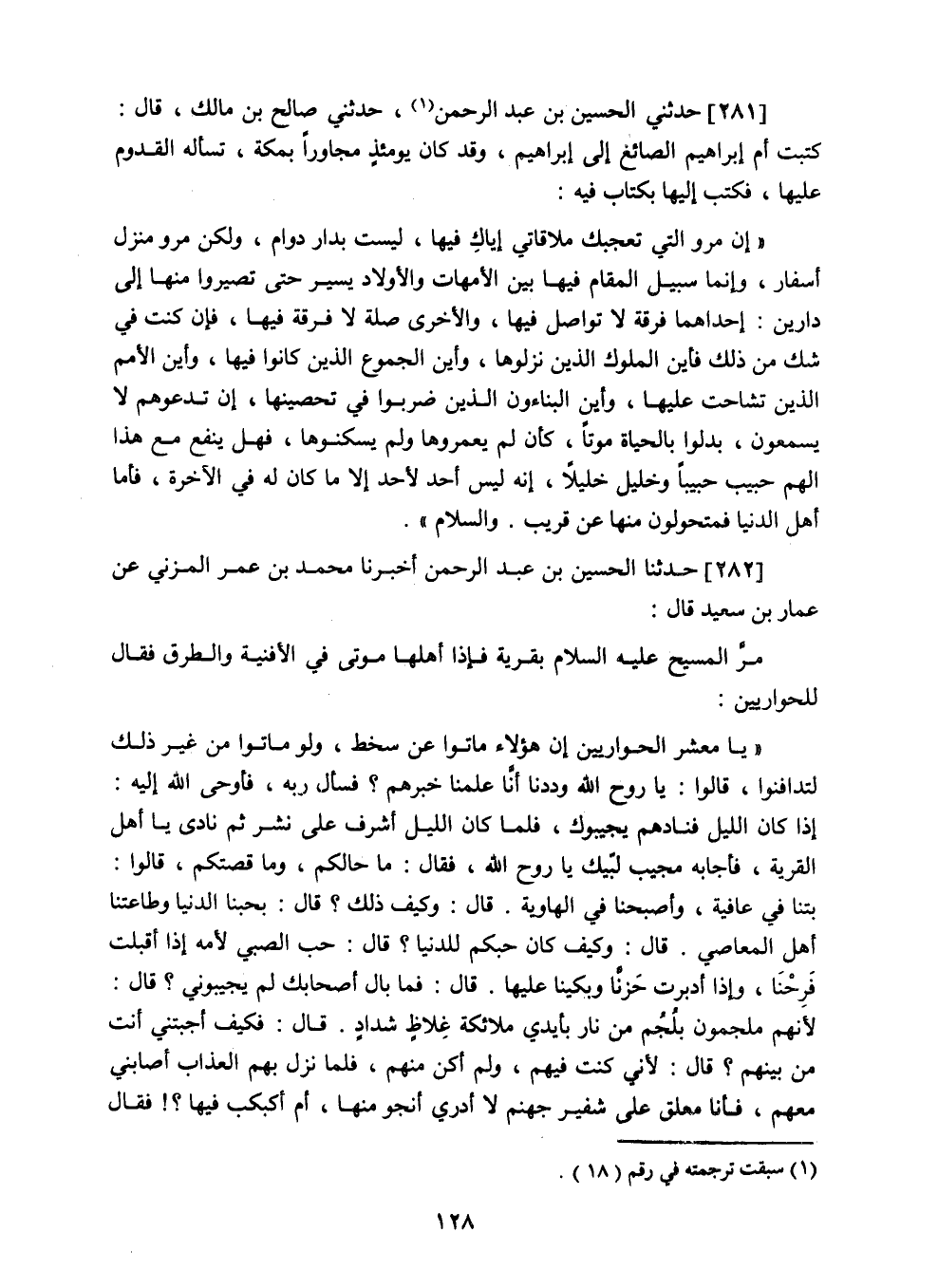 282 - حدثنا الحسين بن عبد الرحمن أخبرنا محمد بن عمر المزني عن عمار بن سعيد قال: مر المسيح عليه السلام بقرية فإذا أهلها موتى في الأفنية والطرق فقال للحواريين: