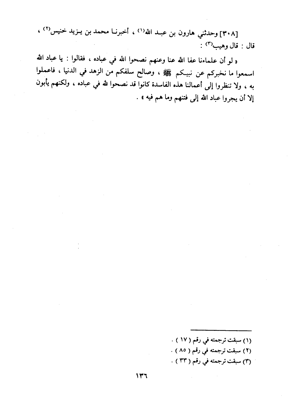 308 - وحدثني هارون بن عبد الله، أخبرنا محمد بن يزيد خنيس قال: قال وهيب: