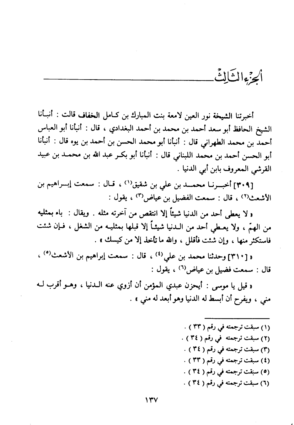 310 - وحدثنا محمد بن علي، قال: سمعت إبراهيم بن الأشعث قال: سمعت فضيل بن عياض، يقول:
