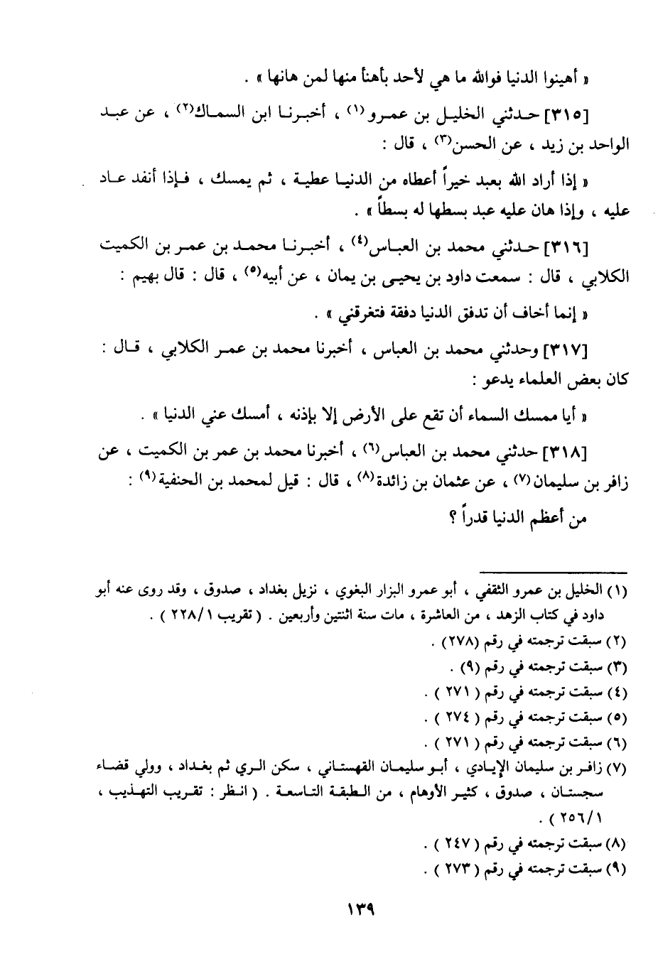 318 - حدثني محمد بن العباس، أخبرنا محمد بن عمر بن الكميت، عن زافر بن سليمان، عن عثمان بن زائدة، قال: قيل لمحمد بن الحنفية: