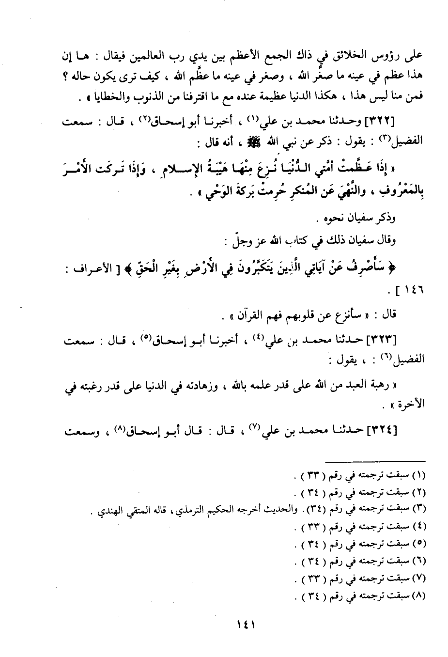 322 - وحدثنا محمد بن علي، أخبرنا أبو إسحاق، قال: سمعت الفضيل: يقول: ذكر عن نبي الله صلى الله عليه وسلم، أنه قال: