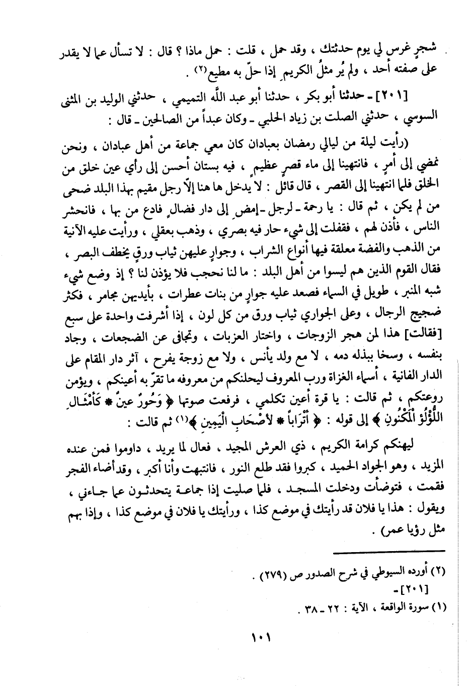 201 - حَدَّثَنَا أَبُو بَكْرٍ، نا أَبُو عَبْدِ اللَّهِ التَّمِيمِيُّ، ثني الْوَلِيدُ بْنُ الْمُثَنَّى السُّوسِيُّ، ثني الصَّلْتُ بْنُ زِيَادٍ الْحَلَبِيُّ، وَكَانَ عَبْدًا مِنَ الصَّالِحِينَ قَالَ: " §رَأَيْتُ لَيْلَةً مِنْ لَيَالِي رَمَضَانَ بِعَبَادَانَ كَأَنَّ مَعِي جَمَاعَةً مِنْ أَهْلِ عَبَادَانَ وَنَحْنُ نَمْضِي إِلَى أَمْرٍ فَانْتَهَيْنَا إِلَى مَاءِ قَصْرٍ عَظِيمٍ فِيهِ بُسْتَانٌ أَحْسَنُ إِلَى رَأْي عَيْنُ خَلْقٍ مِنَ الْخَلْقِ , فَلَمَّا انْتَهَيْنَا إِلَى الْقَصْرِ قَالَ قَائِلٌ: لَا يَدْخُلُ هَاهُنَا إِلَّا رَجُلٌ مُقِيمٌ بِهَذَا الْبَلَدِ ضَحَّى مَنْ لَمْ يَكُنْ ثُمَّ قَالَ: يَا رَحْمَةُ لِرَجُلٍ , امْضِ إِلَى دَارِ فُضَالٍ فَادْعُ مَنْ بِهَا فَانْحَشَرَ النَّاسُ فَأَذِنَ لَهُمْ فَقَفَلْتُ إِلَى شَيْءٍ حَارَ فِيهِ بَصَرِي وَذَهَبَ بِعَقْلِي وَرَأَيْتُ عَلَيْهِ الْآنِيَةَ مِنَ الذَّهَبِ وَالْفِضَّةِ مُعَلَّقَةً فِيهَا أَنْوَاعُ الشَّرَابِ وَجَوَارٍ عَلَيْهِنَّ ثِيَابُ وَرِقٍ يَخْطَفُ الْبَصَرَ فَقَالَ الْقَوْمُ الَّذِينَ هُمْ لَيْسُوا مِنْ أَهْلِ الْبَلَدِ مَا لَنَا نُحْجَبُ فَلَا يُؤْذَنُ لَنَا إِذْ وُضِعَ شَيْءٌ شِبْهُ الْمِنْبَرِ طَوِيلٌ فِي السَّمَاءِ فَصَعدَ عَلَيْهِ جِوَارٍ مِنْ بَنَاتٍ عَطِرَاتٍ بِأَيْدِيهِنَّ مَجَامِرُ , فَكَثُرَ ضَجِيجُ الرِّجَالِ وَعَلَى الْجَوَارِي ثِيَابُ وَرِقٍ مِنْ كُلِّ لَوْنٍ إِذَا أَشْرَفَتْ وَاحِدَةٌ عَلَى سَبْعٍ فَقَالَتْ هَذَا لِمَنْ هَجَرَ الزَّوْجَاتِ وَاخْتَارَ الْعَزَبَاتِ وَتَجَافَى عَنِ الضَّجَعَاتِ وَجَادَ بِنَفْسِهِ وَسَخَا بِبَذْلِهِ دَمِهِ لَا مَعَ وَلَدٍ يَأْنَسُ وَلَا مَعَ زَوْجَةٍ يَفْرَحُ آثَرَ دَارَ الْمَقَامِ عَلَى الدَّارِ الْفَانِيَةِ , أَسْمَاءُ الْغَزَاةِ وَرَبِّ الْمَعْرُوفِ لِيُحِلَّنَّكُمْ مِنْ مَعْرُوفِهِ مَا تُقَرَّ بِهِ أَعْيُنِكُمْ وَيُؤَمِّنُ رَوْعَتَكُمْ , ثُمَّ قَالَتْ: يَا قُرَّةَ أَعْيُنٍ تَكَلَّمِي فَرَفَعَتْ صَوْتَهَا {وَحُورٌ عِينٌ كَأَمْثَالِ اللُّؤْلُؤِ الْمَكْنُونِ} [الواقعة: 23] إِلَى قَوْلِهِ {أَتْرَابًا لِأَصْحَابِ الْيَمِينِ} [الواقعة: 37] ثُمَّ قَالَتْ: لِيُهْنِكُمْ كَرَامَةُ الْكَرِيمِ ذِي الْعَرْشِ الْمَجِيدِ فَعَّالٍ لِمَا يُرِيدَ دَاوِمُوا فَمَنْ عِنْدَهُ الْمَزِيدُ وَهُوَ الْجَوَادُ الْحَمِيدُ , كَبِّرُوا فَقَدْ طَلَعَ النُّورُ , فَانْتَبَهْتُ وَأَنَا أُكَبِّرُ وَقَدْ أَضَاءَ الْفَجْرُ فَقُمْتُ فَتَوَضَّأْتُ وَدَخَلْتُ الْمَسْجِدَ فَلَمَّا صَلَّيْتُ إِذَا جَمَاعَةٌ يَتَحَدَّثُونَ عَمَّا جَاءَنِي , وَيَقُولُ هَذَا: يَا فُلَانُ قَدْ رَأَيْتُكَ فِي مَوْضِعِ كَذَا وَرَأَيْتُكَ يَا فُلَانُ فِي مَوْضِعِ كَذَا وَإِذَا بِهِمْ مِثْلُ رُؤْيَا عُمَرَ "