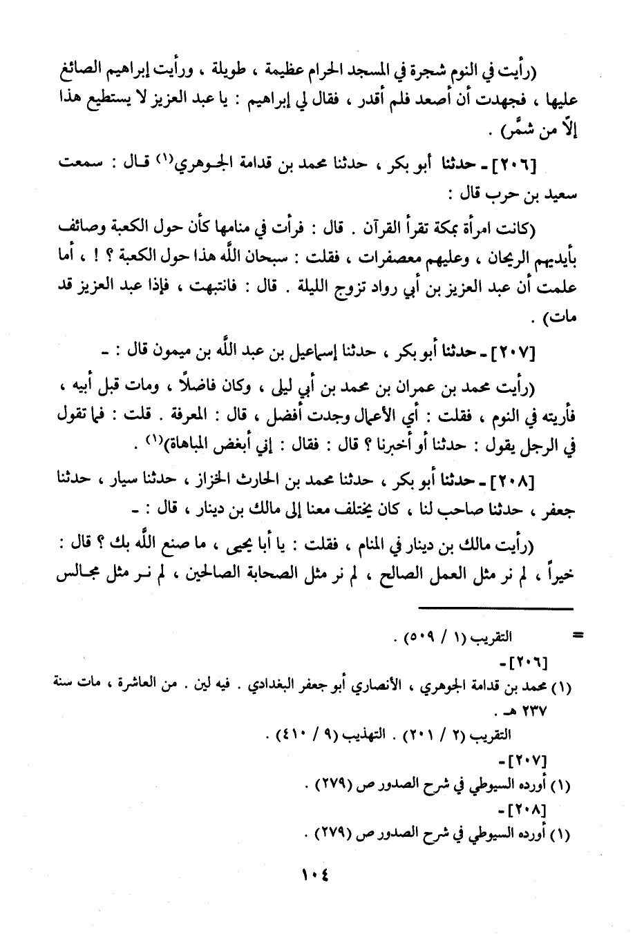 208 - حَدَّثَنَا أَبُو بَكْرٍ، نا مُحَمَّدُ بْنُ الْحَارِثِ الْخَزَّازُ، نا سَيَّارٌ، نا جَعْفَرٌ، نا صَاحِبٌ لَنَا كَانَ يَخْتَلِفُ مَعَنَا إِلَى مَالِكِ بْنِ دِينَارٍ قَالَ: " رَأَيْتُ مَالِكَ بْنَ دِينَارٍ فِي الْمَنَامِ فَقُلْتُ: يَا أَبَا يَحْيَى §مَا صَنَعَ اللَّهُ بِكَ؟ قَالَ: خَيْرًا , لَمْ نَرَ مِثْلَ الْعَمَلِ الصَّالِحِ , لَمْ نَرَ مِثْلَ الصَّحَابَةِ الصَّالِحِينَ , لَمْ نَرَ مِثْلَ مَجَالِسِ -[105]- السَّلَفِ الصَّالِحِ , لَمْ نَرَ مِثْلَ مَجَالِسِ الصَّالِحِينَ "