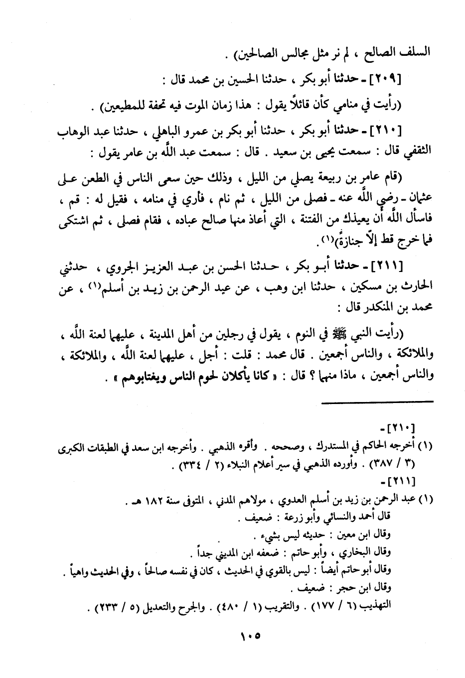 211 - حَدَّثَنَا أَبُو بَكْرٍ، نا الْحَسَنُ بْنُ عَبْدِ الْعَزِيزِ الْجَرَوِيُّ، ثني الْحَارِثُ بْنُ مِسْكِينٍ، نا ابْنُ وَهْبٍ، عَنْ عَبْدِ الرَّحْمَنِ بْنِ زَيْدِ بْنِ أَسْلَمَ، عَنْ مُحَمَّدِ بْنِ الْمُنْكَدِرِ، قَالَ: " رَأَيْتُ النَّبِيَّ صَلَّى اللهُ عَلَيْهِ وَسَلَّمَ فِي النَّوْمِ يَقُولُ فِي رَجُلَيْنِ مِنْ أَهْلِ الْمَدِينَةِ عَلَيْهِمَا لَعْنَةُ اللَّهِ وَالْمَلَائِكَةِ وَالنَّاسِ أَجْمَعِينَ , قَالَ مُحَمَّدٌ: قُلْتُ: أَجَلْ عَلَيْهِمَا لَعْنَةُ اللَّهِ وَالْمَلَائِكَةِ وَالنَّاسِ أَجْمَعِينَ , مَاذَا مِنْهُمَا؟ قَالَ: §كَانَا يَأْكُلَانِ لُحُومَ النَّاسِ وَيَغْتَابُوهُمْ -[106]-. قَالَ: فَقَالَ مُحَمَّدٌ , إِنِّي لَأَعْرِفُهُمَا فَلَوْ مَرِضَا لَا أَعُودُهُمَا وَلَوْ مَاتَا لَا أَشْهَدُهُمَا "