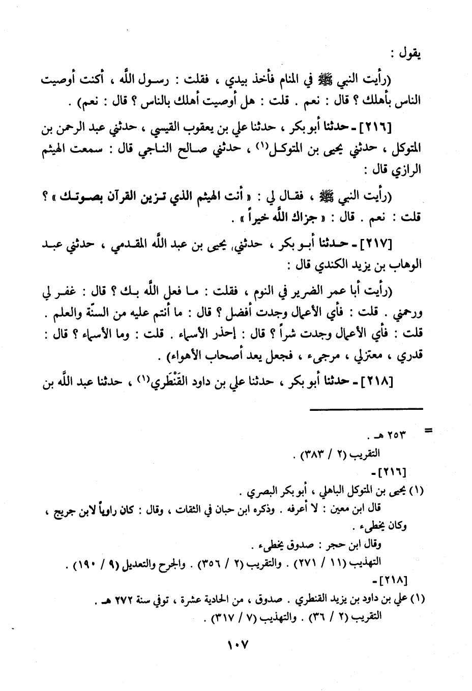 216 - حَدَّثَنَا أَبُو بَكْرٍ، نا عَلِيُّ بْنُ يَعْقُوبَ الْقَيْسِيُّ، ثني عَبْدُ الرَّحْمَنِ بْنُ الْمُتَوَكِّلِ، ثني يَحْيَى بْنُ الْمُتَوَكِّلِ، ثني صَالِحٌ النَّاجِيُّ، قَالَ: سَمِعْتُ الْهَيْثَمَ الرَّازِيَّ، قَالَ: " رَأَيْتُ النَّبِيَّ صَلَّى اللهُ عَلَيْهِ وَسَلَّمَ فَقَالَ لِي: §أَنْتَ الْهَيْثَمُ الَّذِي تُزَيِّنُ الْقُرْآنَ بِصَوْتِكَ؟ قُلْتُ: نَعَمْ , قَالَ: جَزَاكَ اللَّهُ خَيْرًا "