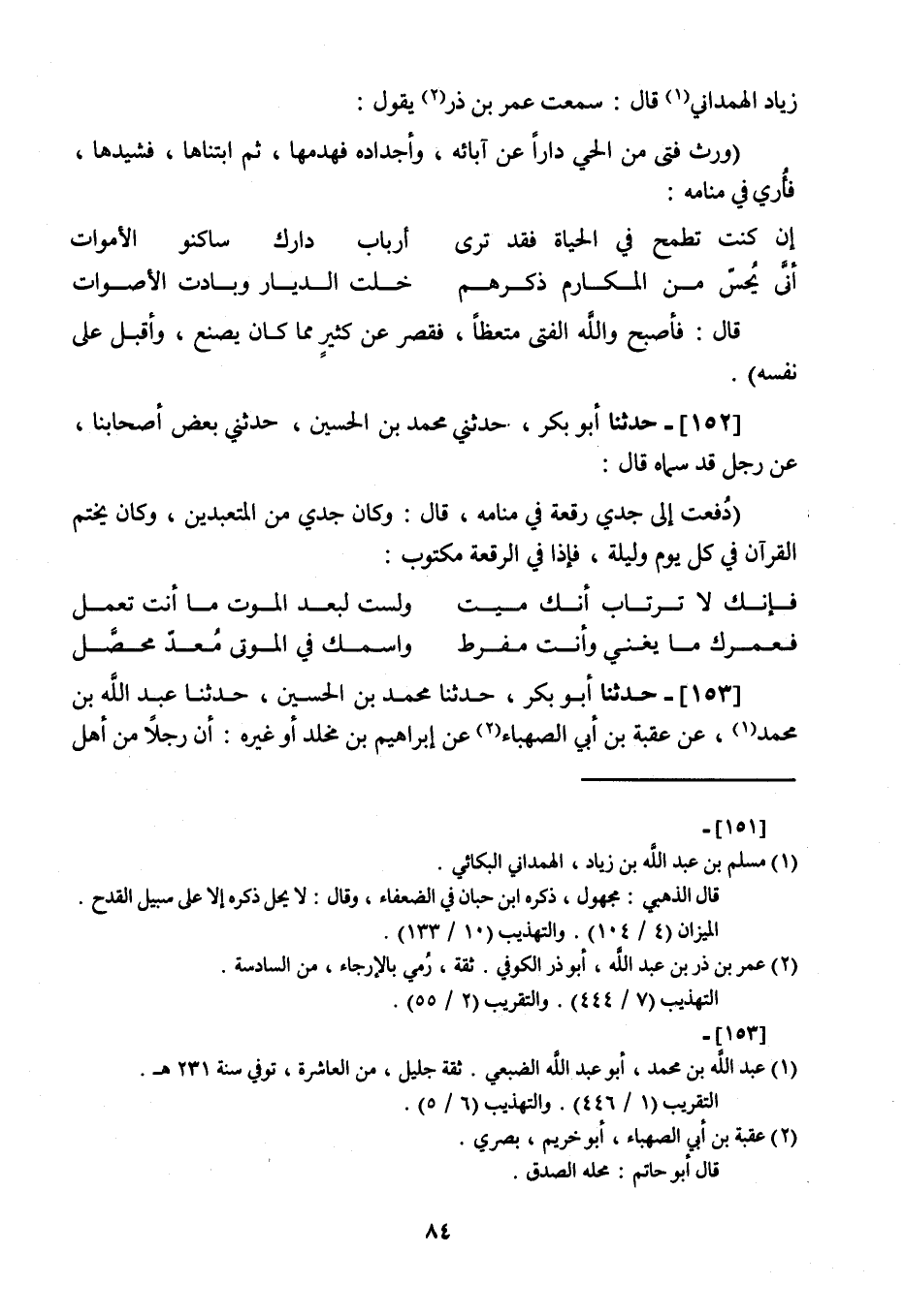 153 - حَدَّثَنَا أَبُو بَكْرٍ، نا مُحَمَّدُ بْنُ الْحُسَيْنِ، نا عَبْدُ اللَّهِ بْنُ مُحَمَّدٍ، عَنْ عُقْبَةَ بْنِ أَبِي الصَّهْبَاءِ، عَنْ إِبْرَاهِيمَ بْنِ مَخْلَدٍ، أَوْ غَيْرِهِ " أَنَّ رَجُلًا مِنْ أَهْلِ -[85]- نَصِيبِينَ يُكْنَى أَبَا عَمْرٍو , وَكَانَ يُكْثِرُ مِنَ الشَّرَابِ , فَعَادَ ذَاتَ لَيْلَةٍ إِلَى مَنْزِلِهِ وَهُوَ شَارِبٌ , فَرَأَى كَأَنَّ قَائِلًا يَقُولُ لَهُ: