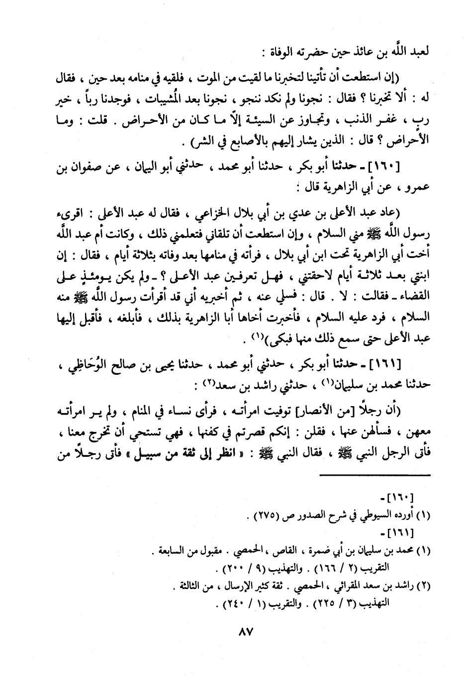 161 - حَدَّثَنَا أَبُو بَكْرٍ، ثني أَبُو مُحَمَّدٍ، نا يَحْيَى بْنُ صَالِحٍ الْوُحَاظِيُّ، نا مُحَمَّدُ بْنُ سُلَيْمَانَ، ثني رَاشِدُ بْنُ سَعْدٍ، " أَنَّ رَجُلًا مِنَ الْأَنْصَارِ تُوُفِّيَتِ امْرَأَتُهُ , فَرَأَى نِسَاءً فِي الْمَنَامِ وَلَمْ يَرَ امْرَأَتَهُ مَعَهُنَّ , فَسَأَلَهُنَّ عَنْهَا , فَقُلْنَ: إِنَّكُمْ قَصَّرْتُمْ فِي كَفَنِهَا فَهِيَ تَسْتَحِي أَنْ تَخْرُجَ مَعَنَا , فَأَتَى الرَّجُلُ النَّبِيَّ صَلَّى اللهُ عَلَيْهِ وَسَلَّمَ , فَقَالَ النَّبِيُّ صَلَّى اللهُ عَلَيْهِ وَسَلَّمَ: §انْظُرْ إِلَى ثِقَةٍ مِنْ سَبِيلٍ , فَأَتَى رَجُلًا مِنَ -[88]- الْأَنْصَارِ حَضَرَتْهُ الْوَفَاةُ فَأَخْبَرَهُ فَقَالَ الْأَنْصَارِيُّ: إِنْ كَانَ أَحَدٌ يُبَلِّغُ الْمَوْتَى بَلَّغْتُهُ , قَالَ: فَتُوُفِّيَ الْأَنْصَارِيُّ فَجَاءَ بِثَوْبَيْنِ مَبْرُورَيْنِ بِالزَّعْفَرَانِ , فَجَعَلَهُمَا فِي كَفَنِ الْأَنْصَارِيِّ , فَلَمَّا كَانَ اللَّيْلُ رَأَى النِّسْوَةَ مَعَهُنَّ امْرَأَتُهُ وَعَلَيْهَا الثَّوْبَانِ الْأَصْفَرَانِ "