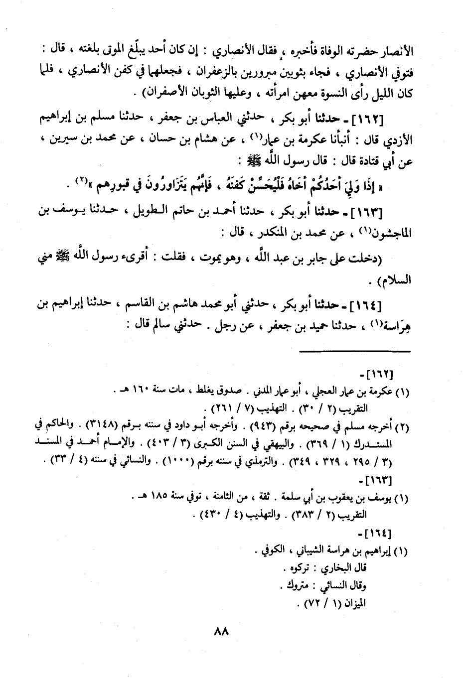 162 - حَدَّثَنَا أَبُو بَكْرٍ، ثني الْعَبَّاسُ بْنُ جَعْفَرٍ، نا مُسْلِمُ بْنُ إِبْرَاهِيمَ الْأَزْدِيُّ، قَالَ: أَنْبَأَنَا عِكْرِمَةُ بْنُ عَمَّارٍ، عَنْ هِشَامِ بْنِ حَسَّانَ، عَنْ مُحَمَّدِ بْنِ سِيرِينَ، عَنْ أَبِي قَتَادَةَ، قَالَ: قَالَ رَسُولُ اللَّهِ صَلَّى اللهُ عَلَيْهِ وَسَلَّمَ: «§إِذَا وَلِيَ أَحَدُكُمْ أَخَاهُ فَلْيُحْسِنْ كَفَنَهُ , فَإِنَّهُمْ يَتَزَاوَرُونَ فِي قُبُورِهِمْ»