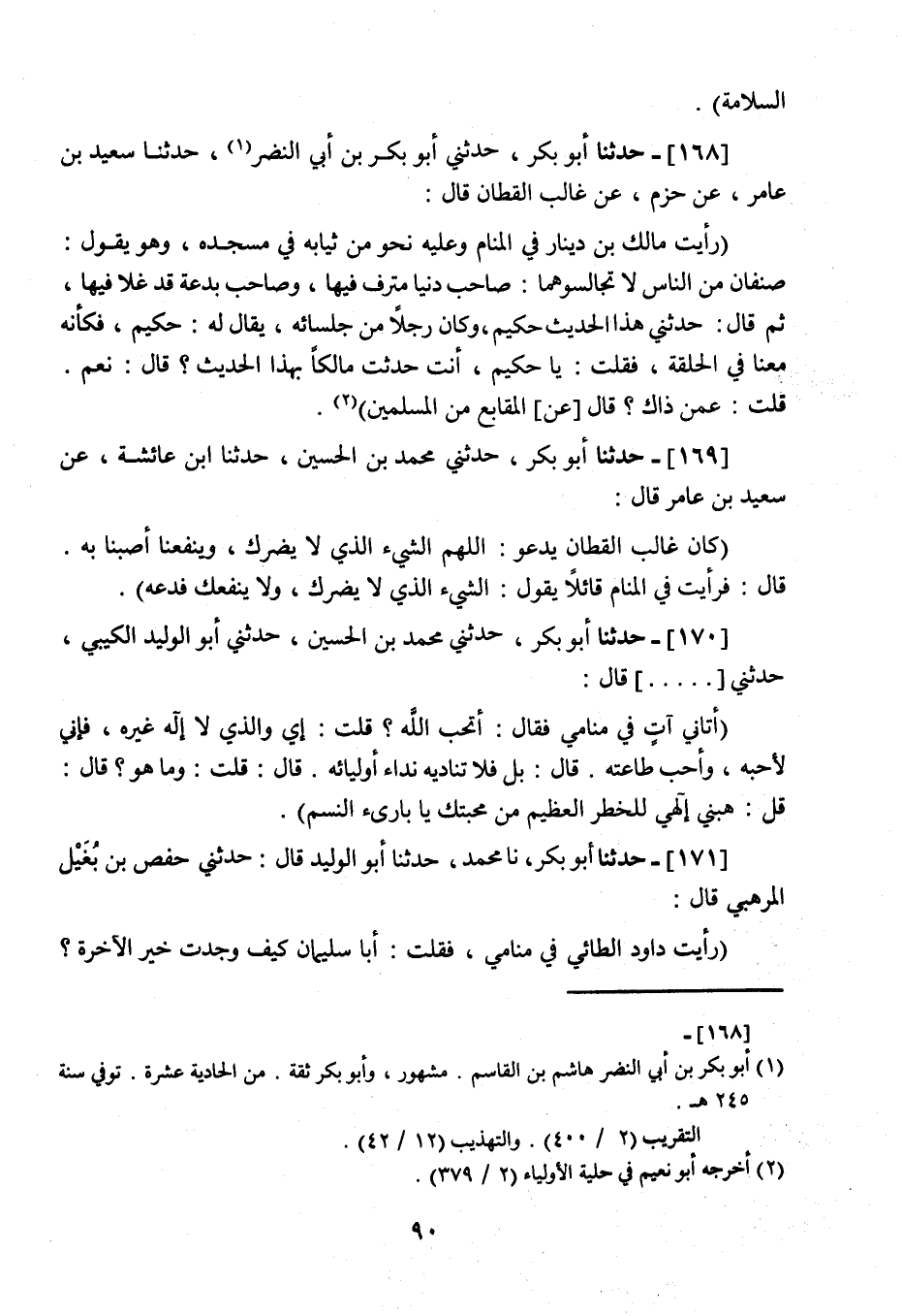 168 - حَدَّثَنَا أَبُو بَكْرٍ، ثني أَبُو بَكْرِ بْنُ أَبِي النَّضْرِ، نا سَعِيدُ بْنُ عَامِرٍ، عَنْ حَزْمٍ، عَنْ غَالِبٍ الْقَطَّانِ، قَالَ: " رَأَيْتُ مَالِكَ بْنَ دِينَارٍ فِي الْمَنَامِ وَعَلَيْهِ نَحْوٌ مِنْ ثِيَابِهِ فِي مَسْجِدِهِ وَهُوَ يَقُولُ: §صِنْفَانِ مِنَ النَّاسِ لَا تُجَالِسُوهُمَا: صَاحِبُ دُنْيَا مُتْرَفٌ فِيهَا وَصَاحِبُ بِدْعَةٍ قَدْ غَلَا فِيهَا , ثُمَّ قَالَ: وَثني هَذَا الْحَدِيثَ حَكِيمٌ , وَكَانَ رَجُلًا مِنْ جُلَسَائِهِ يُقَالُ لَهُ حَكِيمٌ , فَكَأَنَّهُ مَعَنَا فِي الْحَلْقَةِ فَقُلْتُ: يَا حَكِيمُ أَنْتَ حَدَّثْتَ مَالِكًا بِهَذَا الْحَدِيثِ؟ قَالَ: نَعَمْ , قُلْتُ: عَمَّنْ ذَاكَ قَالَ: عَنِ الْمَقَابِعِ مِنَ الْمُسْلِمِينَ "