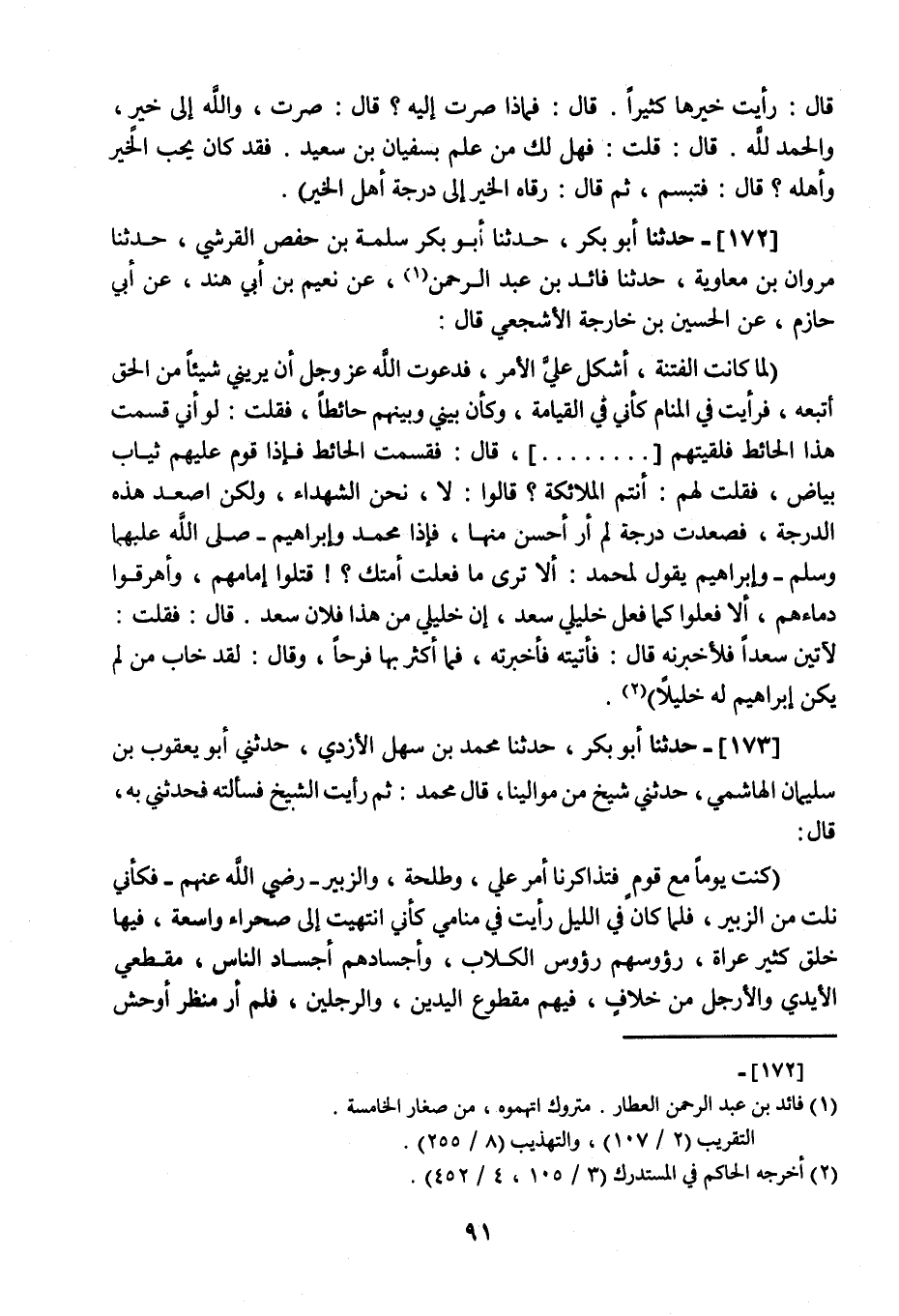 172 - حَدَّثَنَا أَبُو بَكْرٍ، نا أَبُو بَكْرٍ سَلَمَةُ بْنُ حَفْصٍ الْقُرَشِيُّ، نا مَرْوَانُ بْنُ مُعَاوِيَةَ، نا فَائِدُ بْنُ عَبْدِ الرَّحْمَنِ، عَنْ نُعَيْمِ بْنِ أَبِي هِنْدٍ، عَنْ أَبِي حَازِمٍ، عَنِ الْحُسَيْنِ بْنِ خَارِجَةَ الْأَشْجَعِيِّ، قَالَ: " §لَمَّا كَانَتِ الْفِتْنَةُ أُشْكِلَ عَلَيَّ الْأَمْرُ , فَدَعَوْتُ اللَّهَ عَزَّ وَجَلَّ أَنْ يُرِيَنِي شَيْئًا مِنَ الْحَقِّ أَتْبَعُهُ , فَرَأَيْتُ فِيَ الْمَنَامِ كَأَنِّي فِي الْقِيَامَةِ وَكَأَنَّ بَيْنِي وَبَيْنَهُمْ حَائِطًا فَقُلْتُ: لَوْ أَنِّي قَسَمْتُ هَذَا الْحَائِطَ فَلَقِيتُهُمْ , قَالَ: فَقَسَمْتُ الْحَائِطَ فَإِذَا قَوْمٌ عَلَيْهِمْ ثِيَابُ بَيَاضٍ فَقُلْتُ لَهُمْ: أَنْتُمُ الْمَلَائِكَةُ؟ قَالُوا: لَا , نَحْنُ الشُّهَدَاءُ وَلَكِنِ اصْعَدْ هَذِهِ الدَّرَجَةَ , فَصَعِدْتُ دَرَجَةً لَمْ أَرَ أَحْسَنَ مِنْهَا فَإِذَا مُحَمَّدٌ وَإِبْرَاهِيمَ صَلَّى اللَّهُ عَلَيْهِمَا وَسَلَّمَ , وَإِبْرَاهِيمُ يَقُولُ لِمُحَمَّدٍ: أَلَا تَرَى مَا فَعَلَتْ أُمَّتُكَ؟ قَتَلُوا إِمَامَهُمْ وَأَهْرَقُوا دِمَاءَهُمْ , أَلَا فَعَلُوا كَمَا فَعَلَ خَلِيلِي سَعْدٌ , إِنَّ خَلِيلِي مِنْ هَذَا فُلَانٌ سَعْدٌ , قَالَ: فَقُلْتُ: لَآتِيَنَّ سَعْدًا فَلَأُخْبِرَنَّهُ , قَالَ: فَأَتَيْتُهُ فَأَخْبَرْتُهُ , فَمَا أَكْثَرَ بِهَا فَرَحًا وَقَالَ لَقَدْ خَابَ مَنْ لَمْ يَكُنْ إِبْرَاهِيمُ لَهُ خَلِيلًا