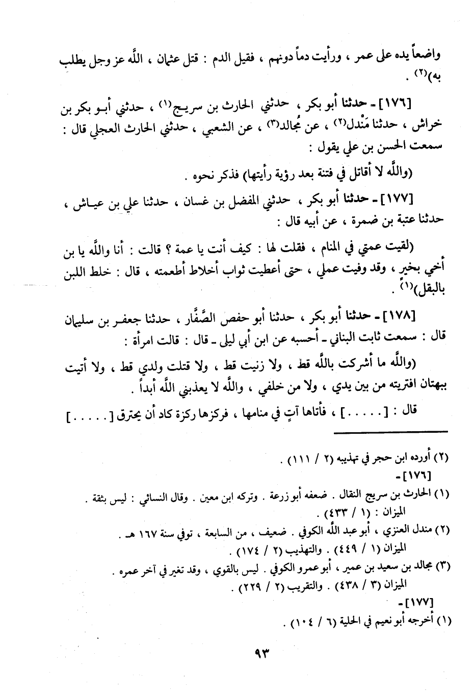 176 - حَدَّثَنَا أَبُو بَكْرٍ، ثني الْحَارِثُ بْنُ سُرَيْجٍ، ثني أَبُو بَكْرِ بْنُ خِرَاشٍ، نا مِنْدَلٌ، عَنْ مُجَالِدٍ، عَنِ الشَّعْبِيِّ، ثني الْحَارِثُ الْعِجْلِيُّ، قَالَ: سَمِعْتُ الْحَسَنَ بْنَ عَلِيٍّ، يَقُولُ: «§وَاللَّهِ لَا أُقَاتِلُ فِي فِتْنَةٍ بَعْدَ رُؤْيَةٍ رَأَيْتُهَا» فَذَكَرَ نَحْوَهُ