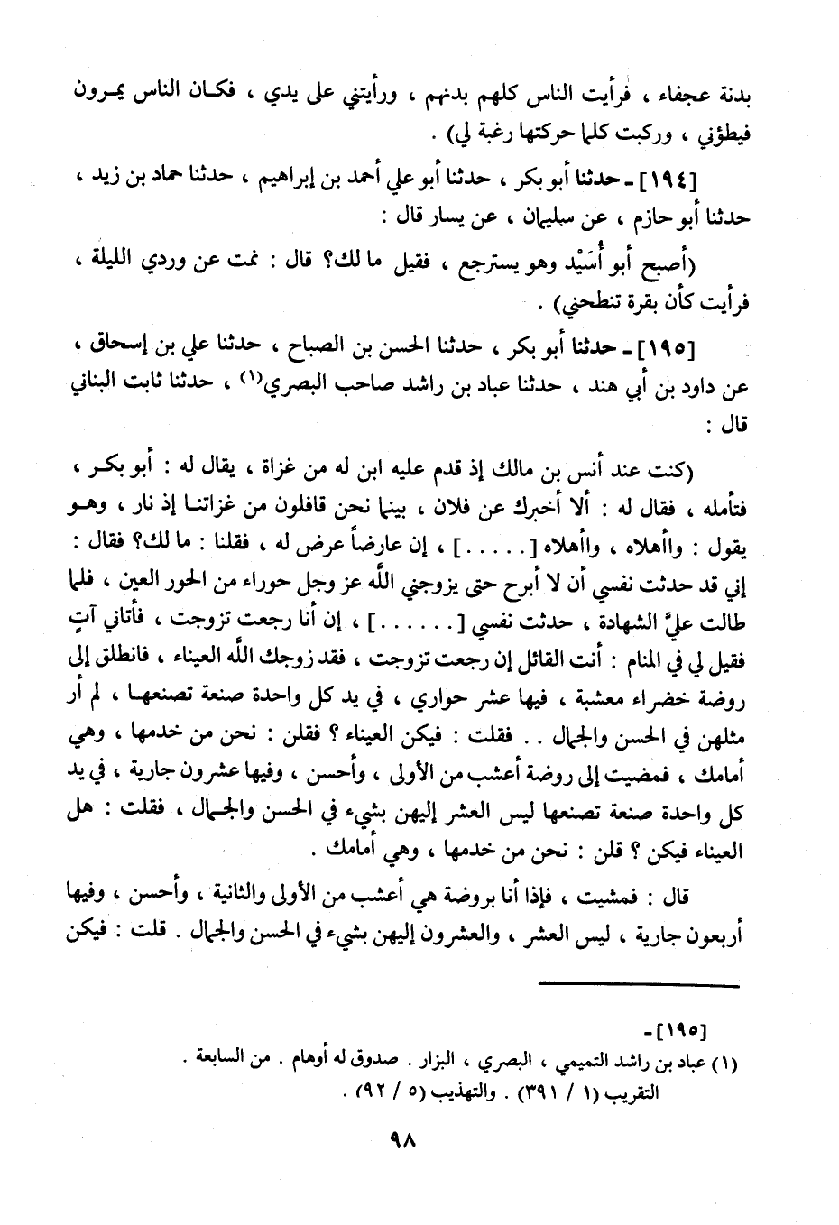 195 - حَدَّثَنَا أَبُو بَكْرٍ، نا الْحَسَنُ بْنُ الصَّبَّاحِ، نا عَلِيُّ بْنُ إِسْحَاقَ، عَنْ دَاوُدَ بْنِ أَبِي هِنْدٍ، نا عَبَّادُ بْنُ رَاشِدٍ، صَاحِبُ الْبَصْرِيِّ , نا ثَابِتٌ الْبُنَانِيُّ، قَالَ: " كُنْتُ عِنْدَ أَنَسِ بْنِ مَالِكٍ إِذْ قَدِمَ عَلَيْهِ ابْنٌ لَهُ مِنْ غَزَاةٍ يُقَالُ لَهُ: أَبُو بَكْرٍ، فَتَأَمَّلَهُ فَقَالَ لَهُ: أَلَا أُخْبِرُكَ عَنْ فُلَانٍ، §بَيْنَمَا نَحْنُ قَافِلُونَ مِنْ غَزَاتِنَا إِذْ نَارٌ وَهُوَ يَقُولُ وَاأَهْلَاهُ وَاأَهْلَاهُ إِنَّ عَارِضًا عَرَضَ لَهُ فَقُلْنَا: مَا لَكَ؟ فَقَالَ: إِنِّي قَدْ حَدَّثْتُ نَفْسِي أَنْ لَا أَبْرَحَ حَتَّى يُزَوِّجَنِي اللَّهُ عَزَّ وَجَلَّ حَوْرَاءَ مِنَ الْحُورِ الْعِينِ , فَلَمَّا طَالَتْ عَلَيَّ الشَّهَادَةُ حَدَّثْتُ نَفْسِي. . . . . . إِنْ أَنَا رَجَعْتُ تَزَوَّجْتُ فَأَتَانِي آتٍ فَقِيلَ لِي فِي الْمَنَامِ: أَنْتَ الْقَائِلُ إِنْ رَجَعْتُ تَزَوَّجْتُ؟ فَقَدْ زَوَّجَكَ اللَّهُ الْعَيْنَاءَ فَانْطَلِقْ إِلَى رَوْضَةٍ خَضْرَاءَ مُعْشِبَةٍ فِيهَا عَشْرُ جَوَارِيٍّ فِي يَدِ كُلِّ وَاحِدَةٍ صَنْعَةٌ تَصْنَعُهَا لَمْ أَرَ مِثْلَهُنَّ فِي الْحُسْنِ وَالْجَمَالِ فَقُلْتُ: فِيكُنَّ الْعَيْنَاءُ؟ فَقُلْنَ نَحْنُ مِنْ خَدَمِهَا وَهِيَ أَمَامَكَ , فَمَضَيْتُ إِلَى رَوْضَةٍ أَعْشَبَ مِنَ الْأُولَى وَأَحْسَنَ وَفِيهَا عِشْرُونَ جَارِيَةٍ فِي يَدِ كُلِّ وَاحِدَةٍ صَنْعَةٌ تَصْنَعُهَا لَيْسَ الْعَشْرُ إِلَيْهِنَّ بِشَيْءٍ فِي الْحُسْنِ وَالْجَمَالِ فَقُلْتُ: هَلِ الْعَيْنَاءُ فِيكُنَّ؟ قُلْنَ: نَحْنُ مِنْ خَدَمِهَا وَهِيَ أَمَامَكَ قَالَ: فَمَشَيْتُ فَإِذَا أَنَا بِرَوْضَةٍ هِيَ أَعْشَبَ مِنَ الْأُولَى وَالثَّانِيَةِ وَأَحْسَنَ , وَفِيهَا أَرْبَعُونَ جَارِيَةٍ لَيْسَ الْعَشْرُ وَالْعِشْرُونَ إِلَيْهِنَّ بِشَيْءٍ فِي الْحُسْنِ وَالْجَمَالِ , قُلْتُ: فِيكُنَّ -[99]- الْعَيْنَاءُ؟ قُلْنَ نَحْنُ مِنْ خَدَمِهَا وَهِيَ أَمَامَكَ , فَإِذَا أَنَا بِيَاقُوتَةٍ مُجَوَّفَةٍ فِيهَا سَرِيرٌ عَلَيْهِ امْرَأَةٌ قَدْ فُصِلَ جَنْبَاهَا عَنِ السَّرِيرِ قُلْتُ: أَنْتِ الْعَيْنَاءُ؟ قَالَتْ: نَعَمْ , مَرْحَبًا , قَالَ: فَهَمَمْتُ أَنْ أَضَعَ يَدِي عَلَيْهَا فَقَالَتْ: مَهْ إِنَّ فِيكَ شَيْئًا مِنَ الرُّوحِ بَعْدُ وَلَكِنْ فِطْرُكَ عِنْدَنَا اللَّيْلَةَ قَالَ: فَأَتَيْتُهُ فَمَا فَرَغَ الرَّجُلُ مِنْ حَدِيثِهِ حَتَّى نَادَى الْمُنَادِي يَا خَيْلَ اللَّهِ ارْكَبِي قَالَ: فَرَكِبْنَا فَصَادَفْنَا الْعَدُوَّ قَالَ: قَالَ: فَإِنِّي لَأَنْظُرُ إِلَى الرَّجُلِ وَإِلَى. . . . . . . وَأَذْكُرُ حَدِيثَهُ فَمَا أَدْرِي أَرَأْسُهُ بَدْرٌ أَمِ الشَّمْسُ سَقَطَتْ أَوَّلُهُ قَالَ: أَنَسٌ رَحِمَهُ اللَّهُ "