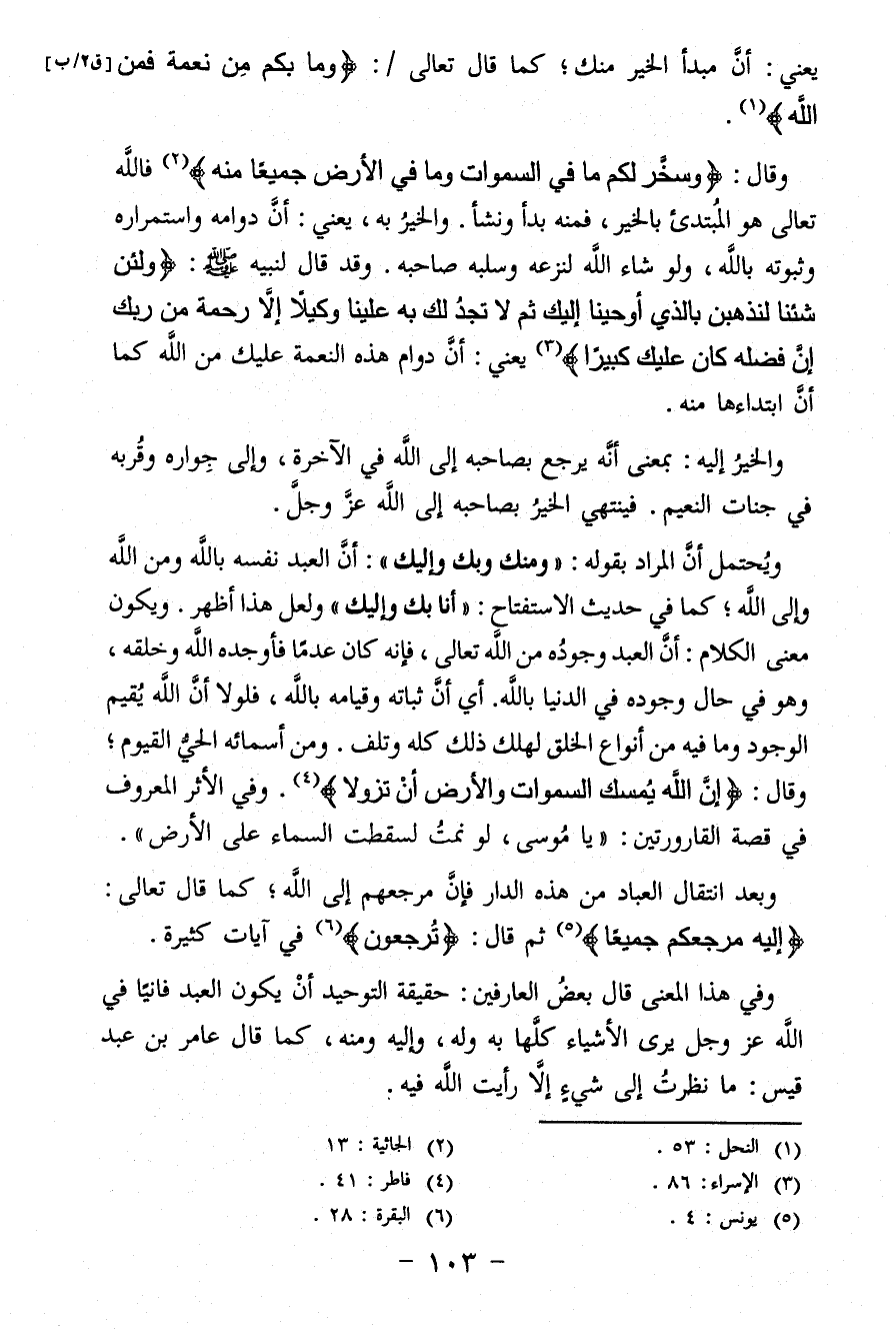 وفي هذا المعنى قال بعضُ العارفين: حقيقة التوحيد أنْ يكون العبد فانيًا في الله عز وجل يرى الأشياء كلَّها به وله، وإليه ومنه، كما قال عامر بن عبد قيس: ما نظرتُ إِلَى شيءٍ إلَّا رأيت الله فيه.