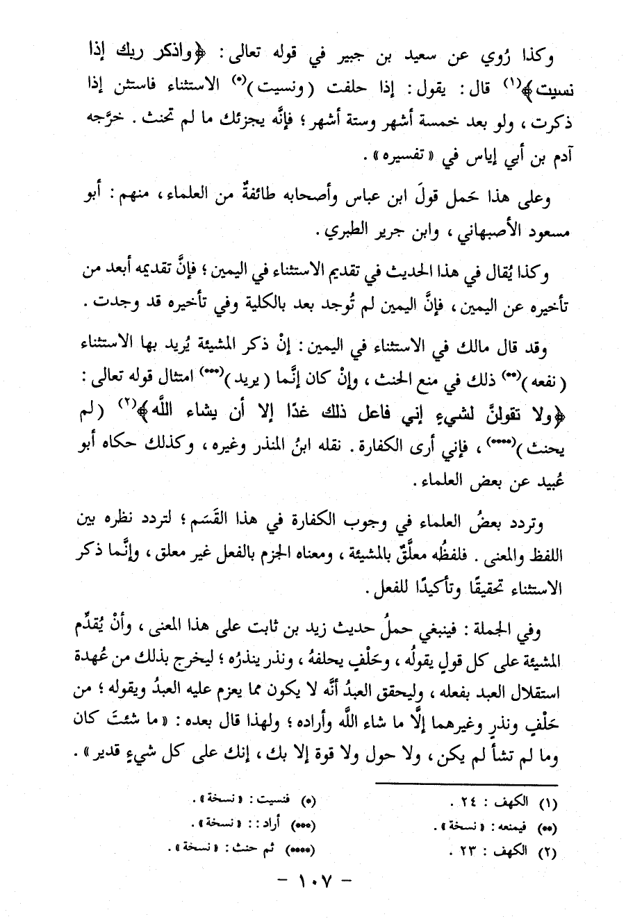 وقد قال مالك في الاستثناء في اليمين: إنْ ذكر المشيئة يُريد بها الاستثناء (نفعه) (**) ذلك في منع الحنث، وإنْ كان إنَّما (ريد) ( ... ) امتثال قوله تعالى: {وَلَا تَقُولَنَّ لِشَيْءٍ إِنِّي فَاعِلٌ ذَلِكَ غَدًا * إِلَّا أَنْ يَشَاءَ اللَّهُ} (¬2) (لم يحنث) (****)، فإني أرى الكفارة. نقله ابنُ المنذر وغيره، وكذلك حكاه أبو عُبيد عن بعض العُلَمَاء.