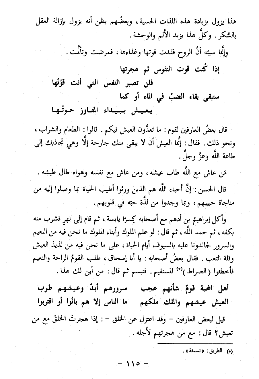 قال بعضُ العارفين لقوم: ما تعدُّون العيش فيكم. قالوا: الطعام والشراب، ونحو ذلك. فَقَالَ: إنَّما العيش أن لا لقى منك جارحة إلاَّ وهي تجاذبك إِلَى طاعة اللَّه وعزَّ وجلَّ.