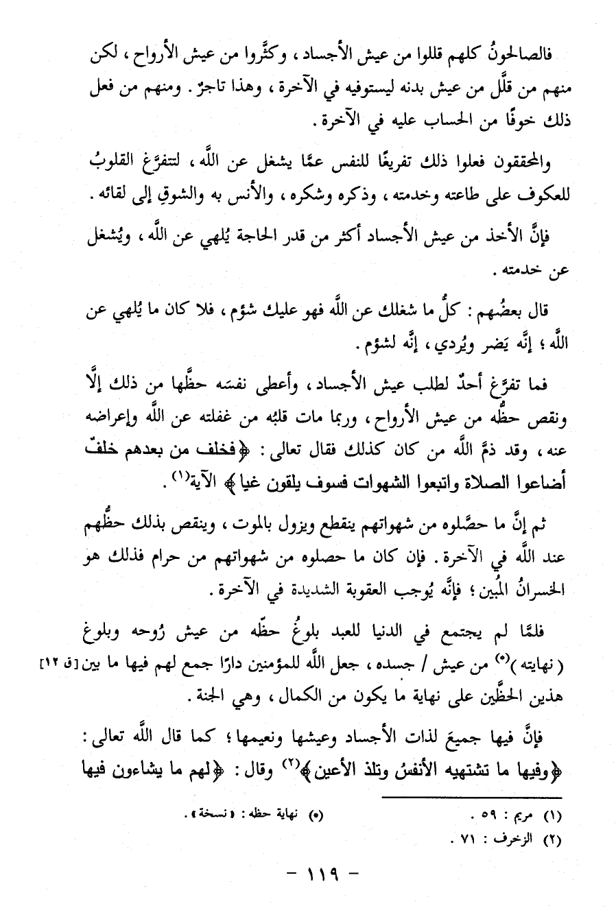 فلمَّا لم يجتمع في الدُّنْيَا للعبد بلوغُ حظّه من عيش رُوحه وبلوغ (نهايته) (*) من عيش جسده، جعل الله للمؤمنين دارًا جمع لهم فيها ما بين هذين الحظَّين عَلَى نهاية ما يكون من الكمال، وهي الجنة.