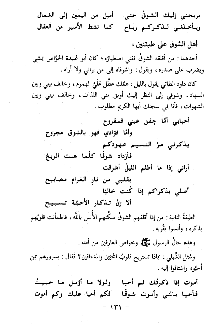 وسُئل الشَّبلي: بماذا تستريح قلوبُ المحبّين والمشتاقين؟ فَقَالَ: بسرورهم بمن أحبُّوه واشتاقوا إِلَيْهِ.