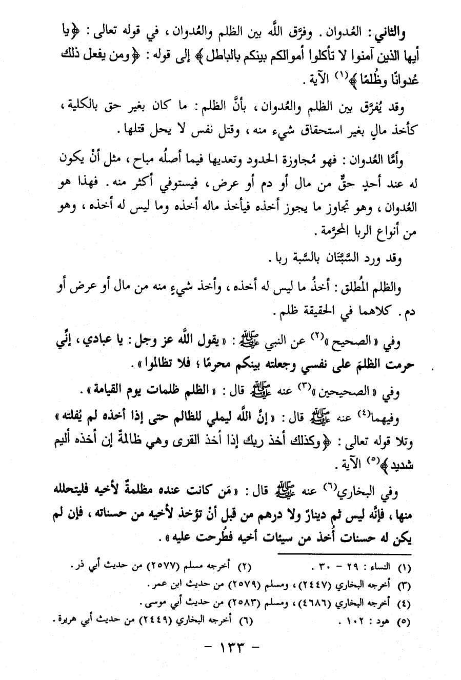 والثاني: العُدوان. وفرَّق اللَّه بين الظلم والعُدوان، في قوله تعالى: {يَا أَيُّهَا الَّذِينَ آمَنُوا لَا تَأْكُلُوا أَمْوَالَكُمْ بَيْنَكُمْ بِالْبَاطِلِ} إِلَى قوله: {وَمَنْ يَفْعَلْ ذَلِكَ عُدْوَانًا وَظُلْمًا} (¬1) الآية.
