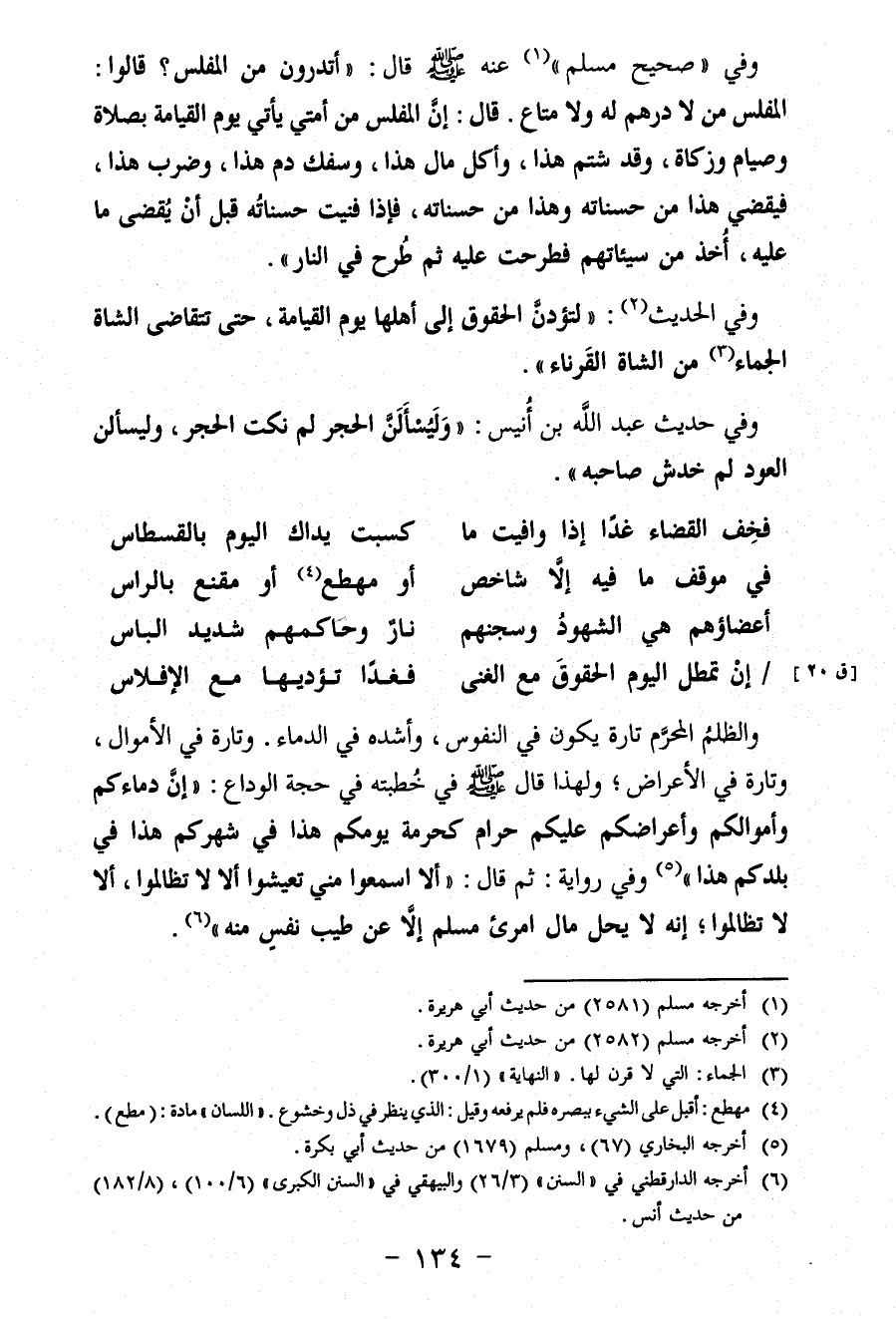 وفي "صحيح مسلم" (¬1) عنه - صلى الله عليه وسلم - قال: «أَتَدْرُونَ مَنِ الْمُفْلِسُ»؟ قَالُوا: المُفْلِسُ مَنْ لَا دِرْهَمَ لَهُ وَلَا مَتَاعَ، قَالَ: «إِنَّ المُفْلِسُ مِنْ أُمَّتِي يَأْتِي يَوْمَ القِيَامَةِ بِصَلَاتِهِ وَصِيَامِهِ وَزَكَاتِهِ، وَقَدْ شَتَمَ هَذَا، وَأَكَلَ مَالَ هَذَا، وَسَفَكَ دَمَ هَذَا، وَضَرَبَ هَذَا، فَيَقْضِي هَذَا مِنْ حَسَنَاتِهِ وَهَذَا مِنْ حَسَنَاتِهِ، فَإِذَا فَنِيَتْ حَسَنَاتُهُ قَبْلَ أَنْ يَُقْضِي مَا عَلَيْهِ، أُخِذَ مِنْ سَيِّئَاتِهِمْ فَطُرِحَتْ عَلَيْهِ ثُمَّ طُرِحَ فِي النَّارِ».