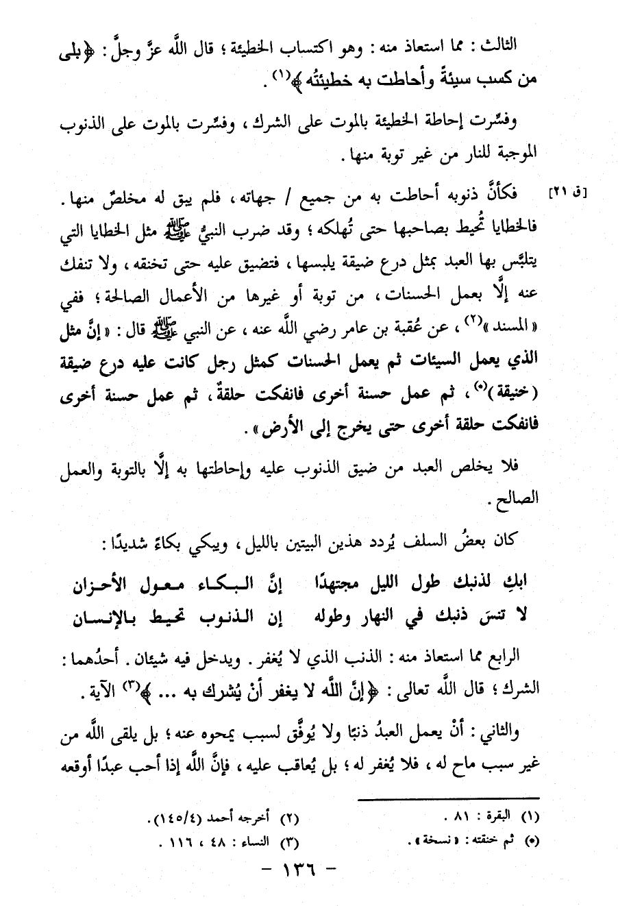 وفسِّرت إحاطة الخطيئة بالموت عَلَى الشرك، وفسِّرت بالموت عَلَى الذنوب الموجبة للنار من غير توبة منها.
